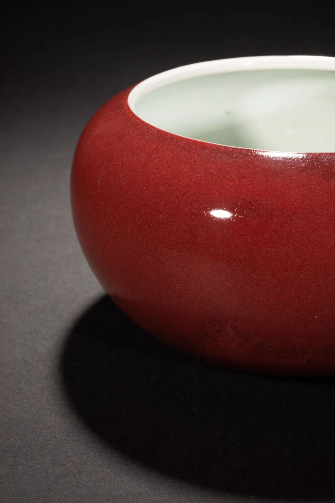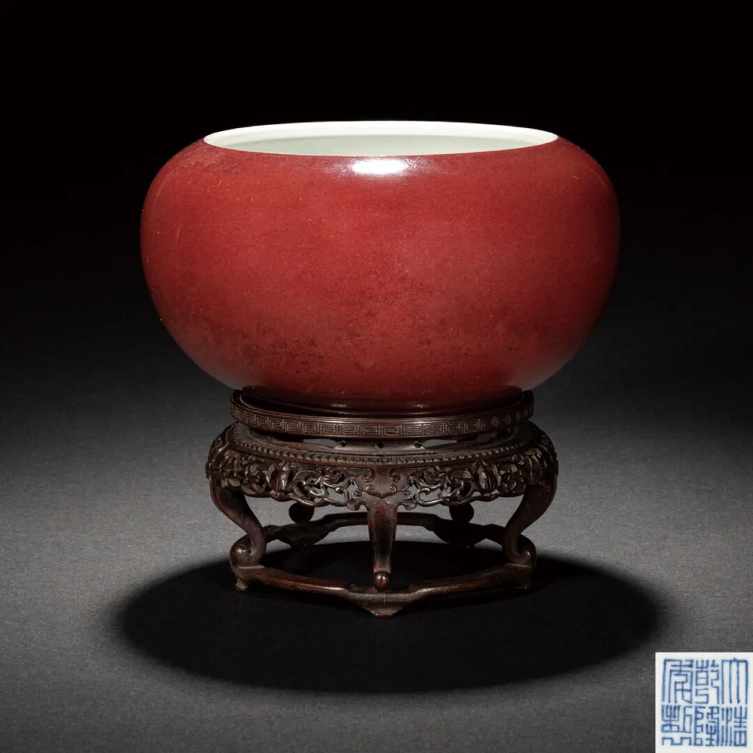 红釉烧成难度较高,因受窑内气氛影响较大,烧造出颜色纯正均匀者极为难得,因此自明初永乐年间创烧成功始,其后各朝无不以此为衡量制瓷水平的标准,清雍正官窑在严格的制度下,烧造技术成熟,用以陈设、赏玩的红釉品种中不乏佳器。此件拍品器形规整,外壁施霁红釉,呈色均匀,肥腴温润,口沿“灯草边”和釉面微现橘皮纹等现象,乃追仿永宣红釉器的效果。青花底书“大清乾隆年制”六字篆书方款。钵造型端庄大气,釉色肥美,其下配有红木座原木盒,十分难得,置于案首,赏心悦目。