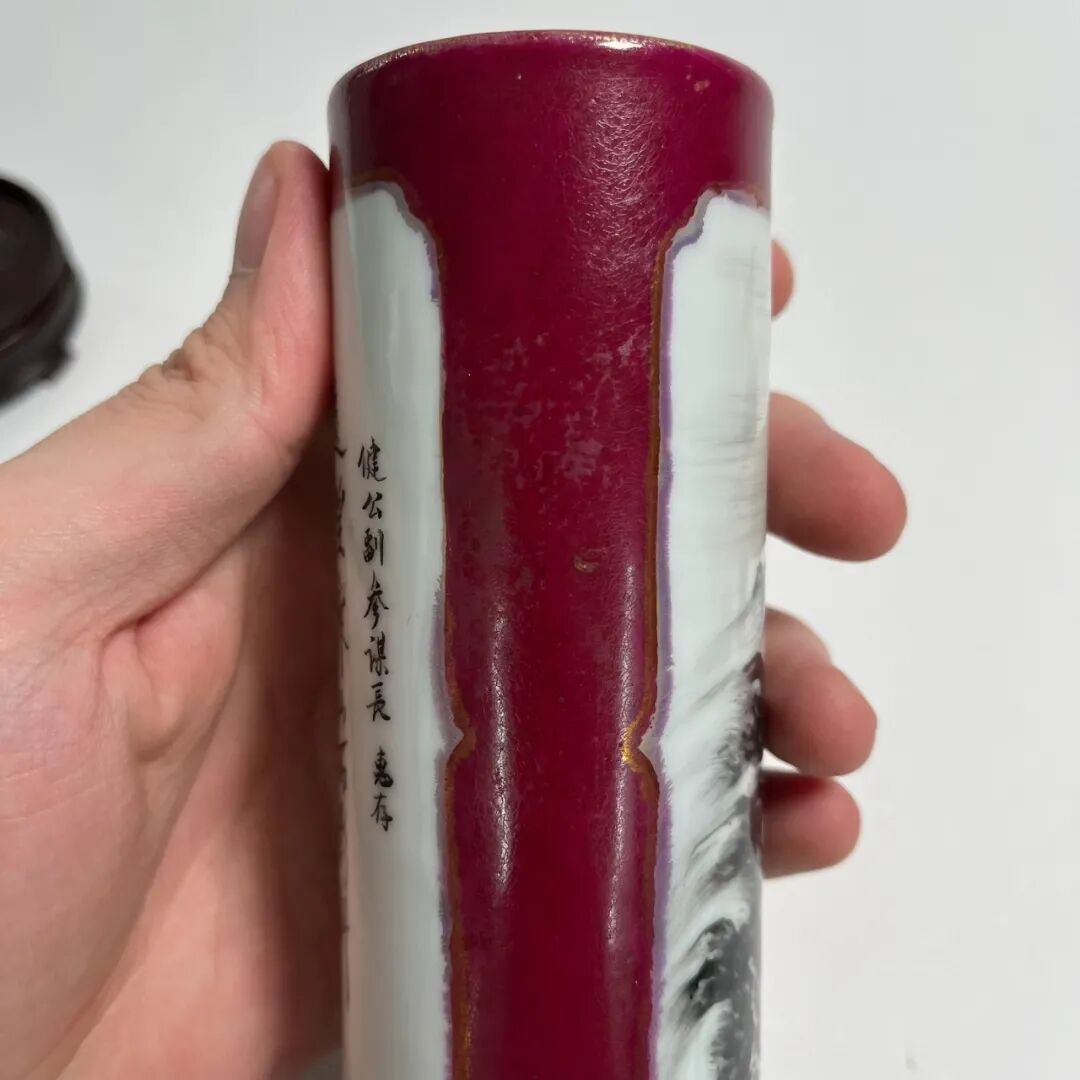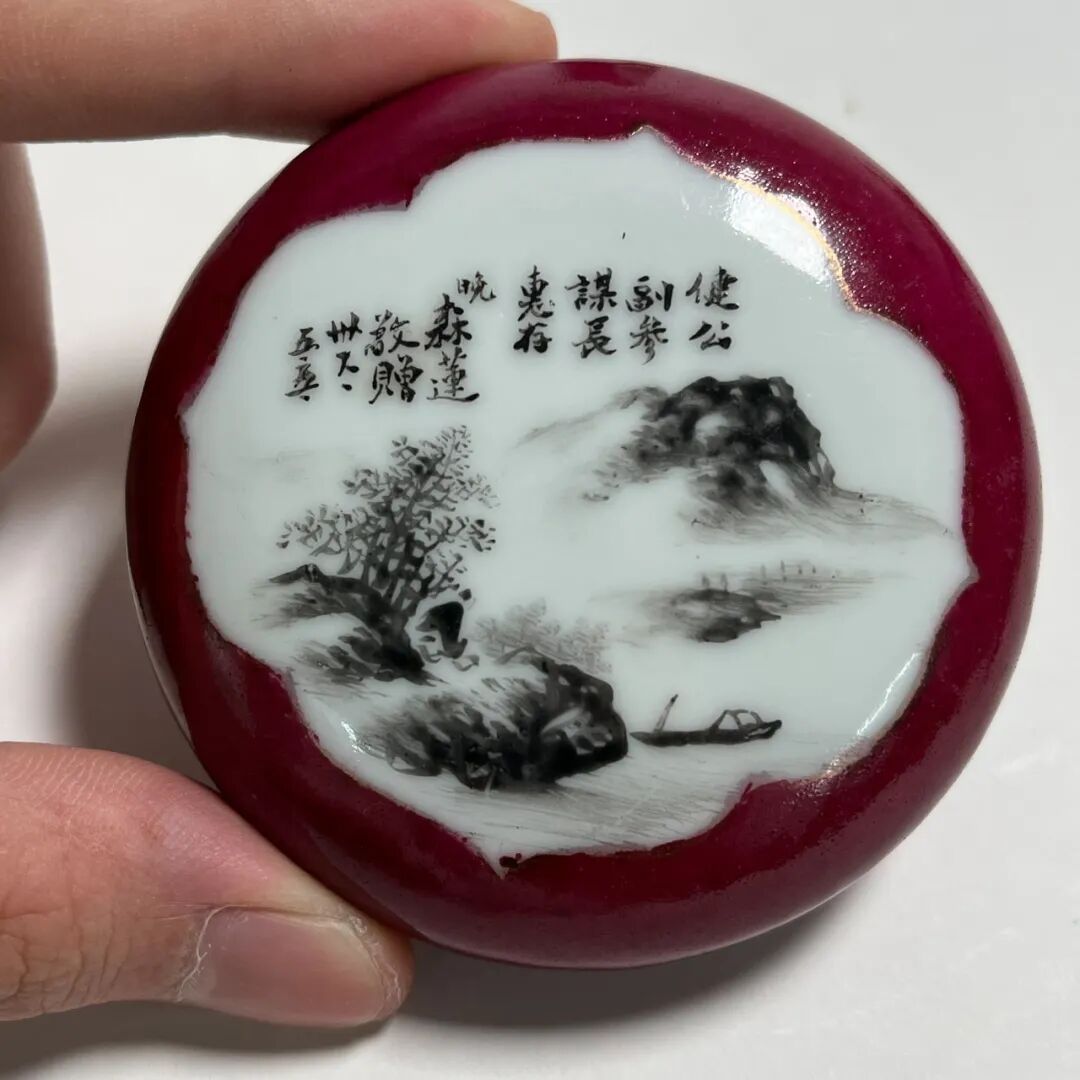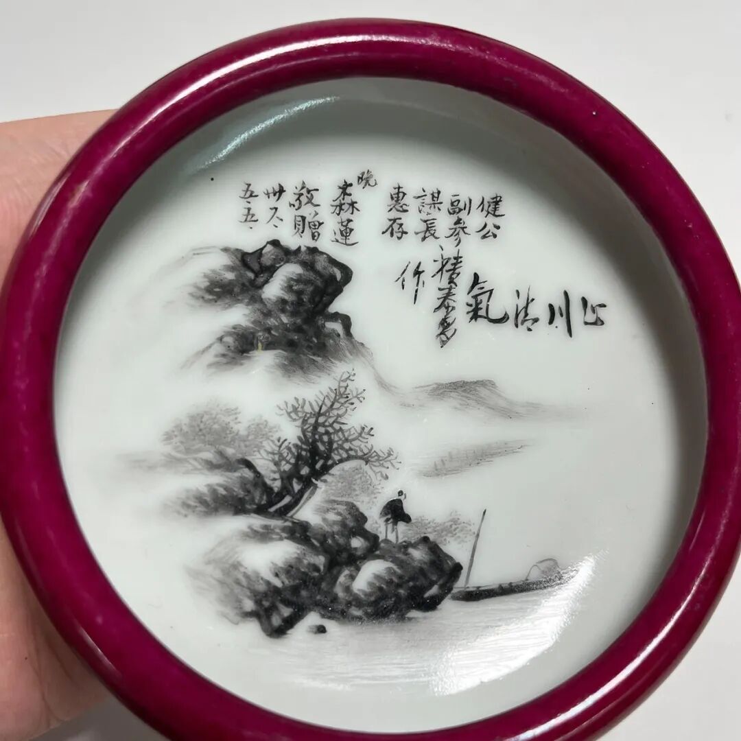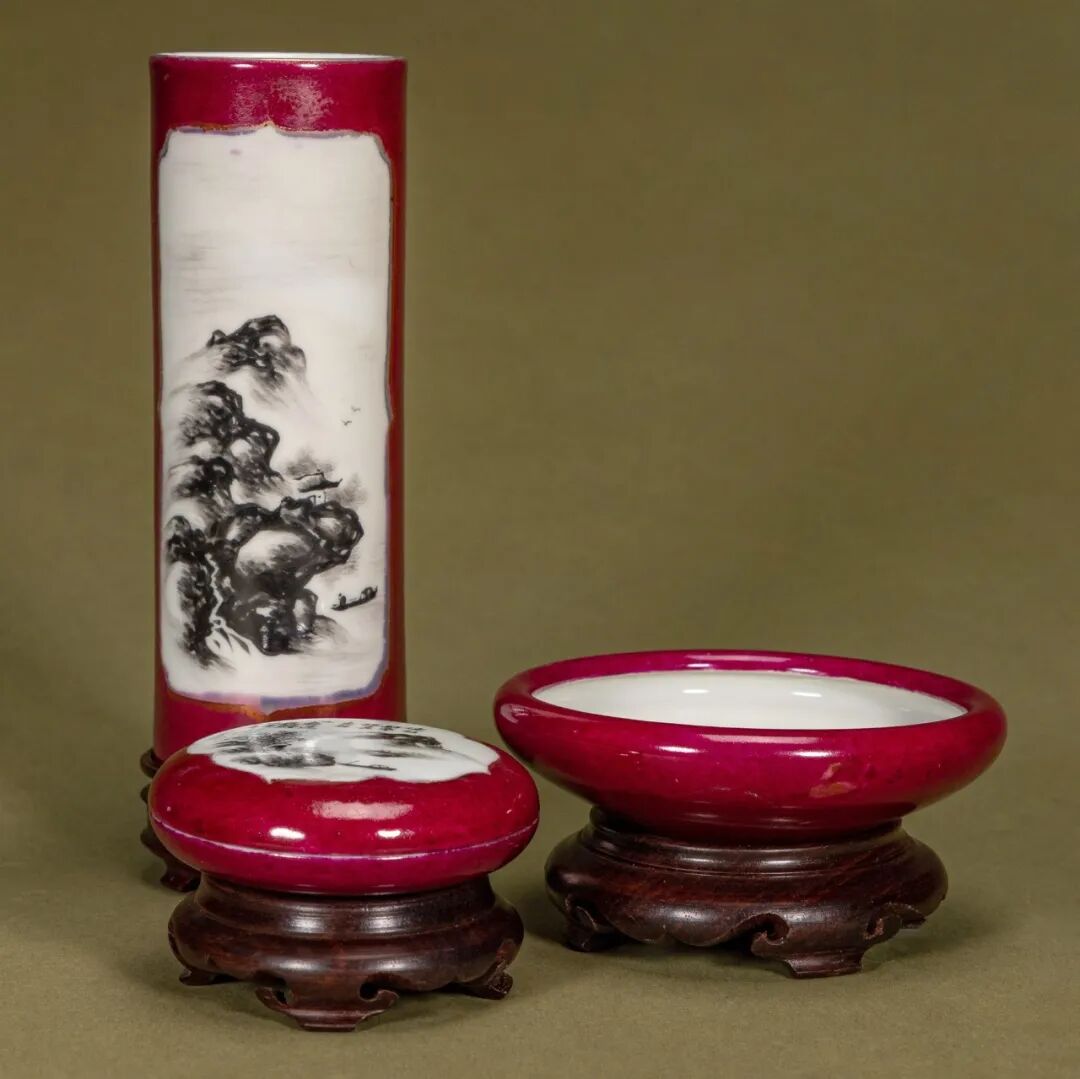 民国 鄢积寿昌 胭脂红地开光墨彩山水文房一套
