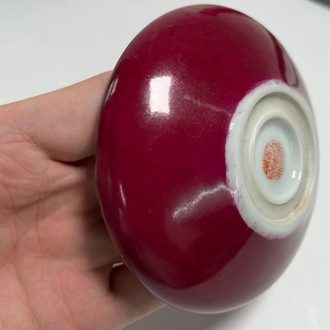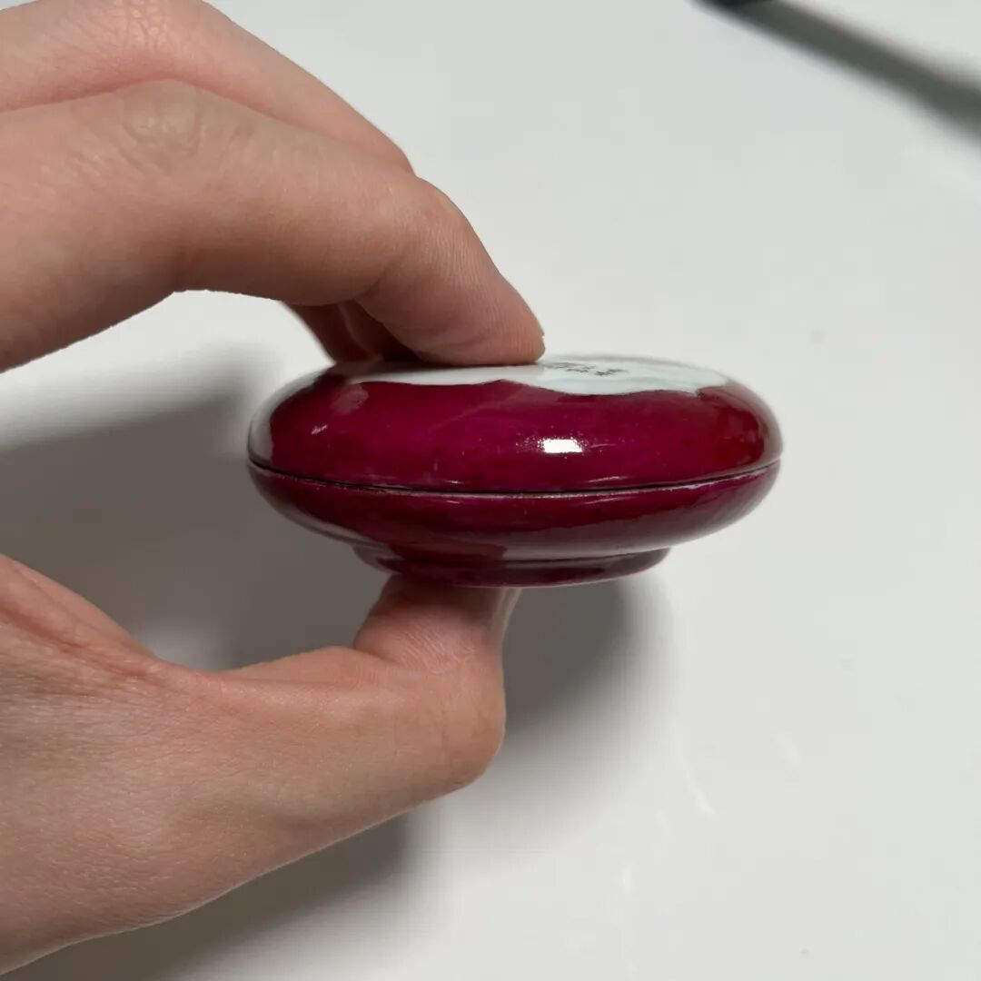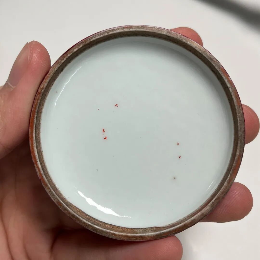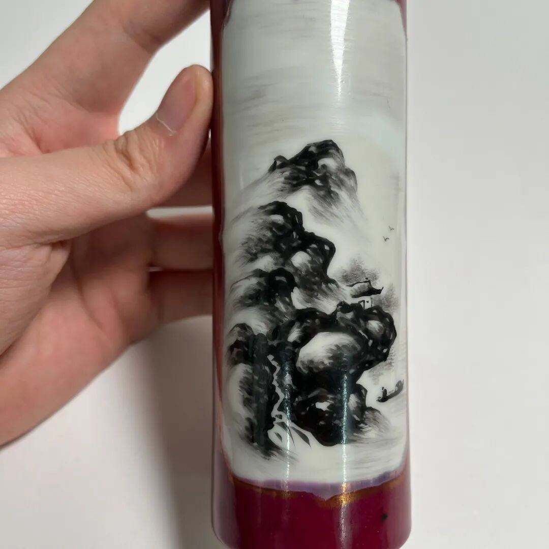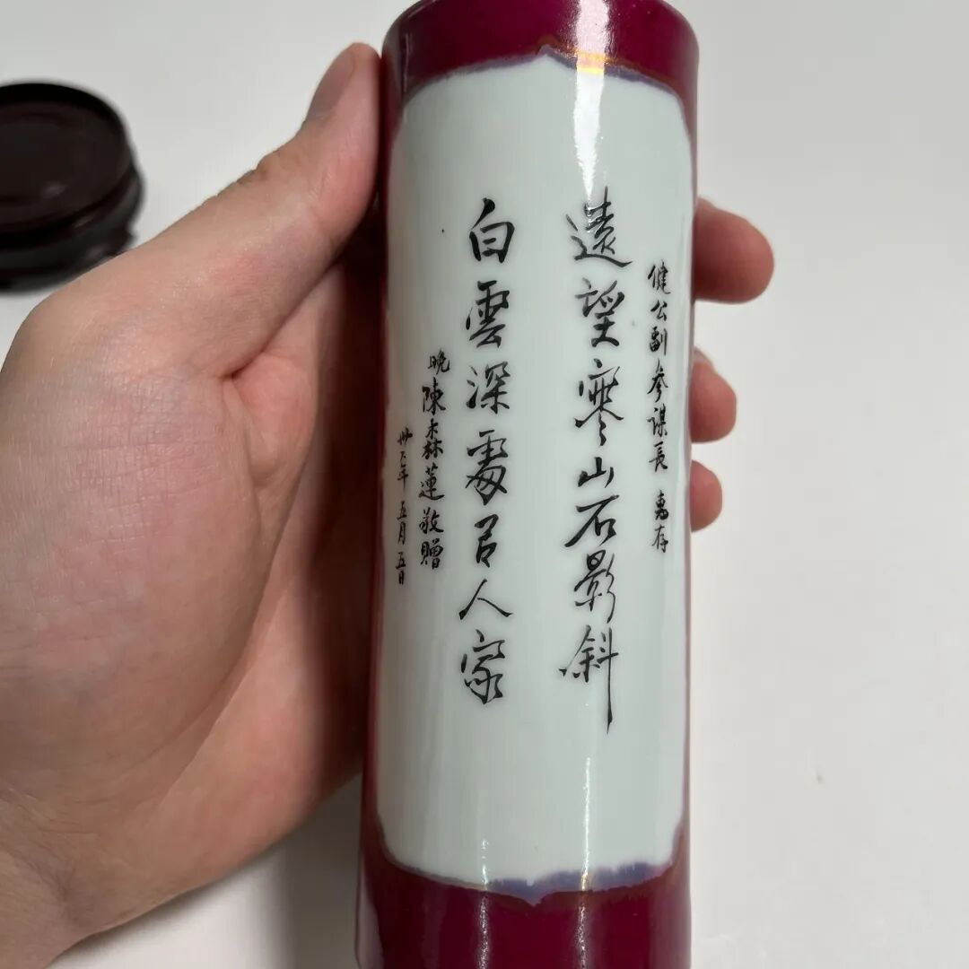 民国 鄢积寿昌 胭脂红地开光墨彩山水文房一套
