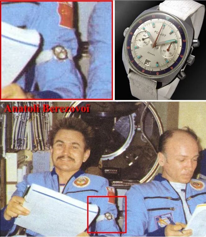 1982年前苏联太空人阿纳托利·别列佐沃与瓦伦丁·列别德夫执行「联盟T-5」太空任务所佩戴的保杰3133机芯手动计时机械腕表(图片来源:NASA)
