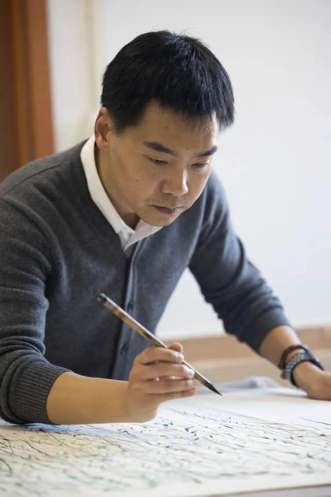 时光如梭,一晃二十多年过去了。去年10月,当《春柳》的印制任务交到我手上时,我感慨万千,先生一生苦行,但他的画作表现得是如此明艳、如此活泼,如同先生的精神写照。《春柳》木版水印制作耗时半年之久,在700小时、数千次砑印后,我渐渐体会到这些遒劲有力、气脉连贯的柳条背后既是根植于现实生活中的风景,又是抽象后点线面的构成,我仿佛读懂了些许先生关于“风筝不断线”的道理。
