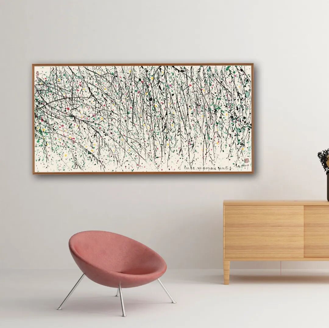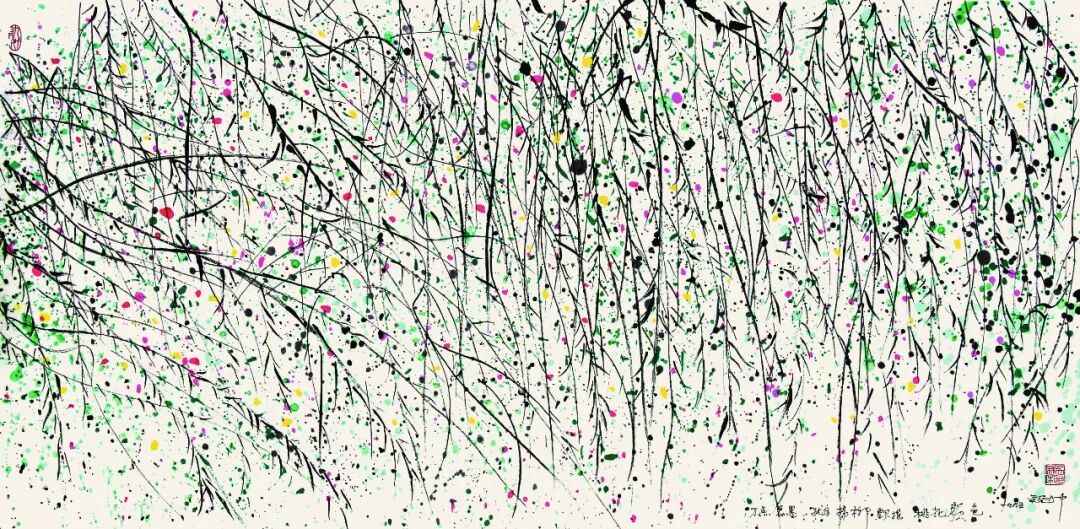 《春柳》中大量彩色的“点”和黑色的“线”构成了整幅画面,这是先生“风筝不断线”中抽象艺术探索的提炼。《春柳》意在“春”,画家用绿色和红色表现“桃花春水绿,春风柳上归”的意境。我理解为绿色寓意春的到来,红色和黄色是点缀其中含苞待放的春花,各色的点是画面生动韵律的重要组成部分。我选用了和原作同料、色彩明亮的水粉色:翠绿、深绿、玫瑰红、柠檬黄。在配制绿色时要注意:在大面积色调一致的绿色中找到色彩的细微变化。大面积不同大小的绿点交辉闪烁使画面空间呈现出看似杂乱的状态,但同时通过疏与密的排列产生了空间的层次感,因此在印制过程中要特别注意观察原作色彩深浅节奏的变化。刷浅色、掸深色,最后在纸上把个别“点”着重表现出来,增加画面的节奏变化。