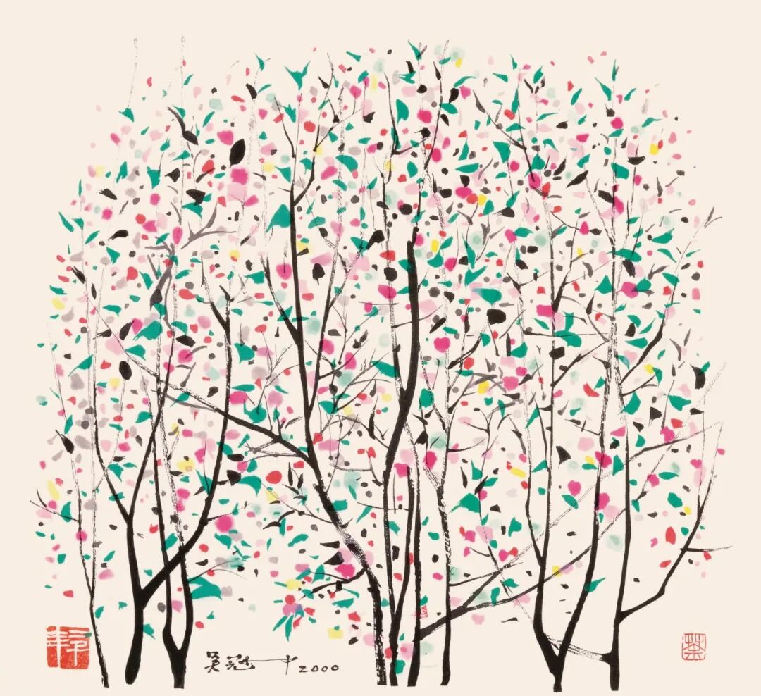 1994年,荣宝斋木版水印工作组专程前往吴先生家中取作品,先生说:“你们荣宝斋卖我的画卖得太快了,我给了你们三张画,没几天就卖完了,以后我就在木版水印上多支持你们一下就行了。”之后,先生为木版水印提供了多张稿件,他还亲自到木版水印车间指导制作,并鼓励我们说:“比我想象得要好!” 《春柳》就是这批稿件中的一件作品,创作于1995年,这个时期正是吴先生从具象的自然景观走向抽象的心灵景观的艺术转换期。