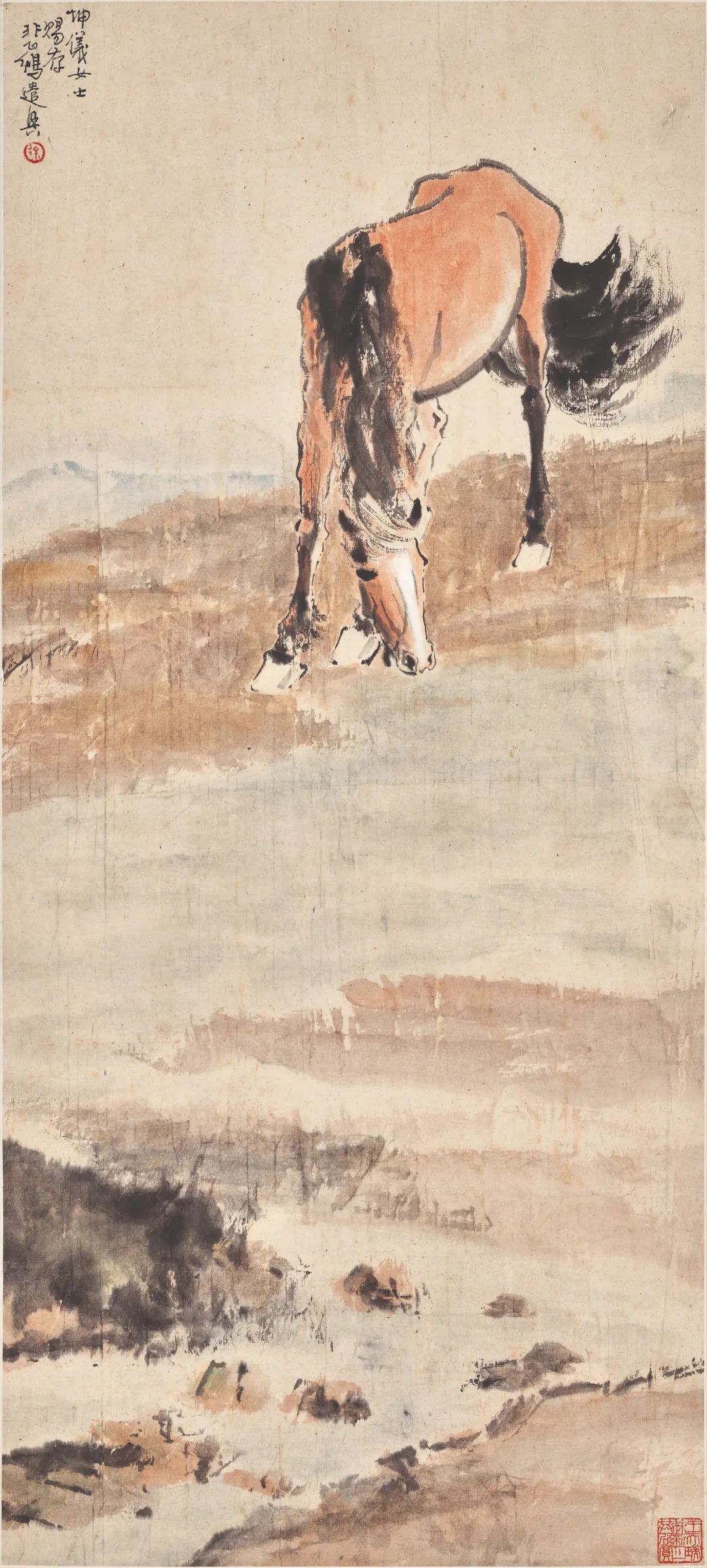 本幅写栗马黑鬃,崚嶒瘦骨,俯身饮水河边。笔墨尤显精到松灵,用笔之粗细干湿,全依马之不同部位,素描的精准与笔墨的灵性完美结合。同是淡墨,饱蘸水分一笔重下写出马腹之圆润,背脊则涩笔表现其骨骼结构,两种质感差异立现。同是毛皮,身体与面部用赭石加红几平面渲染,只用微妙浓淡差别表现起伏转折,令栗色毛发光泽竟如蚕丝;而马尾马鬃则淡墨浓墨齐上,湿笔飞白并施,以尽能事表现其蓬松飘逸,令观者似伸手可触。“饮马” 是徐悲鸿画马常常表现的题材,早在1930年,已有涉猎,该年9月《时代》画报发表其《饮马》作品,据画上题跋,此作曾展示于比利时国际博览会。这年秋天他给舒新城画《饮马》两幅,其中一幅题 “自以为佳”,相较此幅,构图已颇为接近。他有“饮马” 题画诗 “岂止崎岖行万里,艰难获得一瓢饮”,本幅许为女性所作,没有崎岖艰难之感,反而有几分安详静谧之趣。上款 “坤仪” 女士或为徐悲鸿画马最早知音高奇峰之爱徒张坤仪。1934年,徐氏自欧洲返回南京,正是张坤仪将高奇峰逝世的消息告诉徐悲鸿,徐悲鸿为《高奇峰先生遗画集》题词,其中有句:“张女士坤仪以其画见示,言念旧游,凄然泪下”。初秋,徐悲鸿爱屋及乌,曾为张坤仪的作品题跋,赞以 “可永魏风之传”,可见该年,徐、张二人在南京颇有往来,本幅《长河饮马》许正作于当时。徐悲鸿(1895-1953)