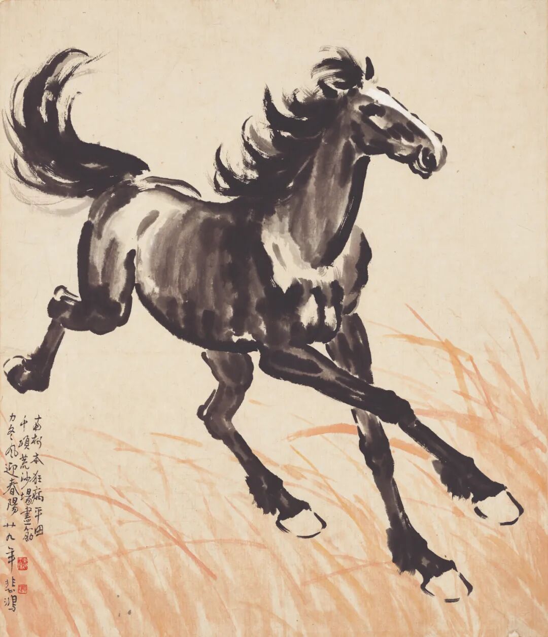 回到中国后,徐悲鸿的艺术逐渐回归传统,中国画成为主要创作形式,早期水彩画风不再出现,大约在1930年代初期,他的画马作品逐渐成熟:线条变化多样,用雄浑粗壮者表现马的整体轮廓;用飞扬者表现马鬃马尾;用精准钩勒者表现嘴鼻、马膝等关键部位。少用渴笔,大笔蘸满水分泼写,酣畅淋漓。背景多空无,或疏疏寥寥交代,令作画之精力、观画之精神,全集中于画中的马上。若说徐悲鸿笔下的狮威严魁伟,是国家民族的象征;那他笔下的马则更似乎是个体的拟人,承载更丰富的涵义与情感:激昂骁勇的、紧张急迫的、沉着坚韧的、迷茫忧愤的,不一而足。徐悲鸿(1895-1953)