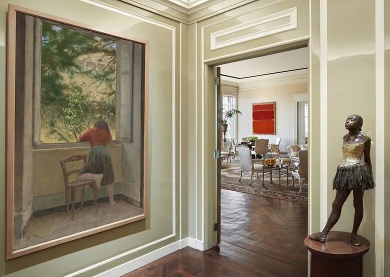 巴斯夫人纽约寓所玄关处的作品︰巴尔蒂斯 (1908-2001) 《窗边的女孩》,1955年作;马克·罗斯科 (1903-1970) 《无题(深浅红色)》,1961年作;艾德加·德加 (1834-1917),《十四岁的小舞者》,1927年铸造。所有艺术品均于2022年5月在佳士得纽约安妮·巴斯珍藏拍卖中呈献。图片: Steve Freihon