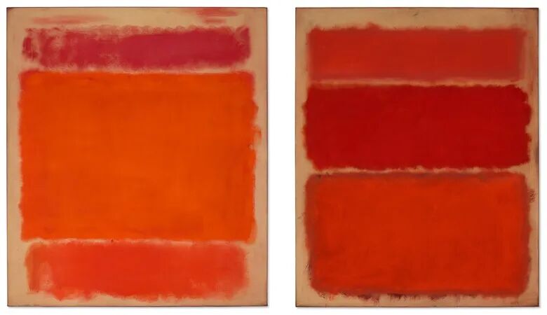 左:马克·罗斯科 (1903-1970)《无题(深浅红色)》,1961年作。油彩 画布。175.3 x 142.2 cm.。估价:美元 60,000,000 - 80,000,000。右:马克·罗斯科 (1903-1970),《1号》,1962年作。油彩 画布。175.3 x 152.4 cm.。估价:美元 45,000,000 - 65,000,000。两幅作品均于2022年5月在佳士得纽约安妮·巴斯珍藏拍卖中呈献