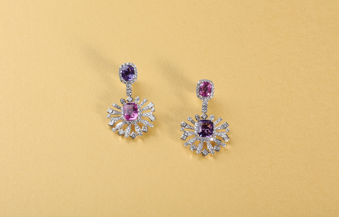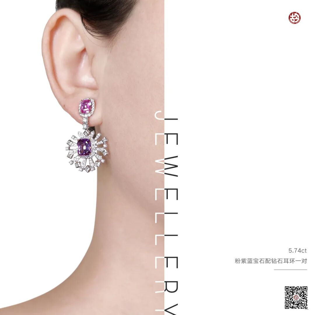 5.74克拉粉紫蓝宝石配钻石耳环一对
