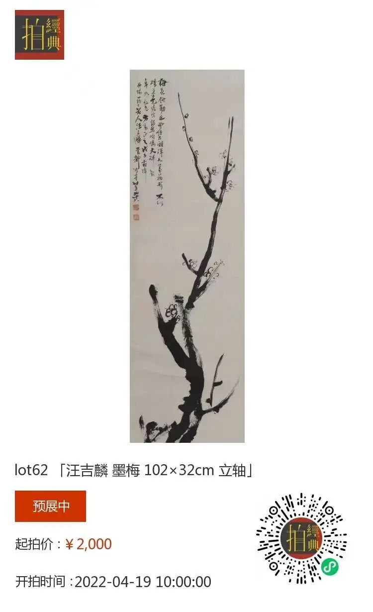 汪吉麟(1871-1960)又名汪蔼士,江苏丹阳市珥陵镇人,寄居北京。常用"画吾自画"的印章,印证了他突破陈规,敢于独创,自成一家的精神风貌。汪吉麟一生爱梅、植梅、咏梅、痴心画梅。汪吉麟与人为善,喜交画友,先后与陈师曾、陈半丁、胡佩衡、王梦白、于非暗、溥心畲等著名画家来往甚密,商讨画学,切磋艺事。