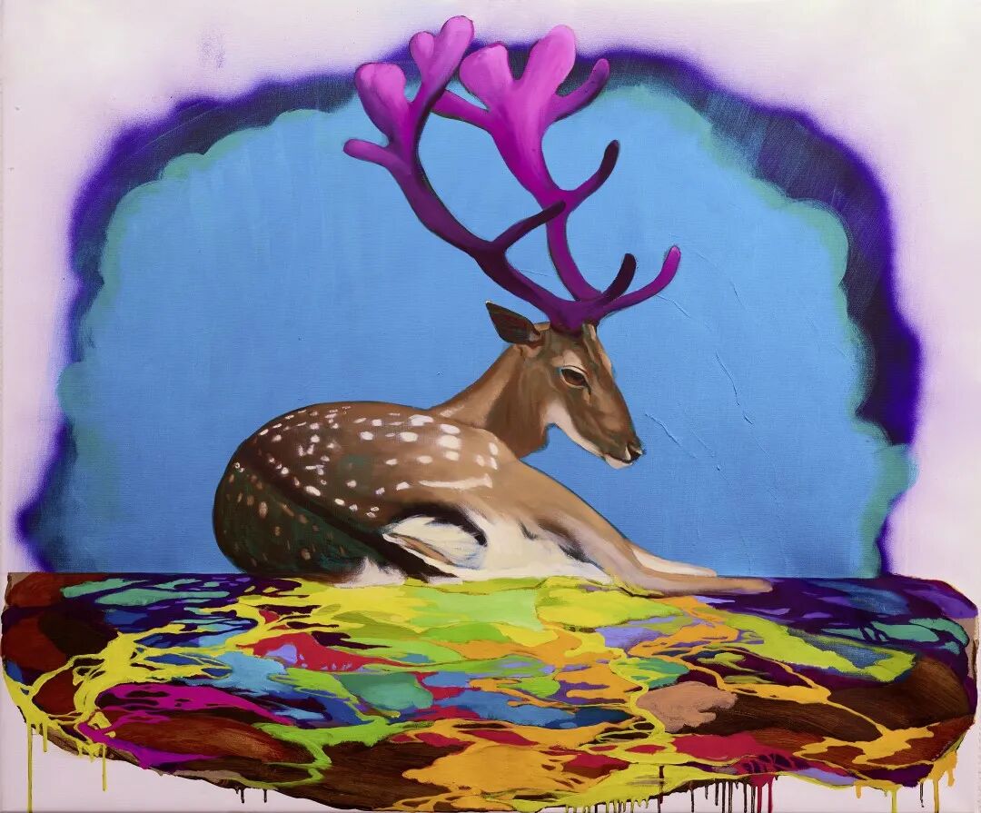 新作“九色鹿”系列的创作灵感源自于他姑婆在从人界通向灵界的入口处遇见的鹿。姑婆告诉他这些鹿守护着灵界,只有答对暗号后才能通过。每一头鹿的巨大鹿角上有宝石般不同颜色的花纹身上还会长有一些蘑菇,这些都暗示了这些鹿身上不同的“气”。