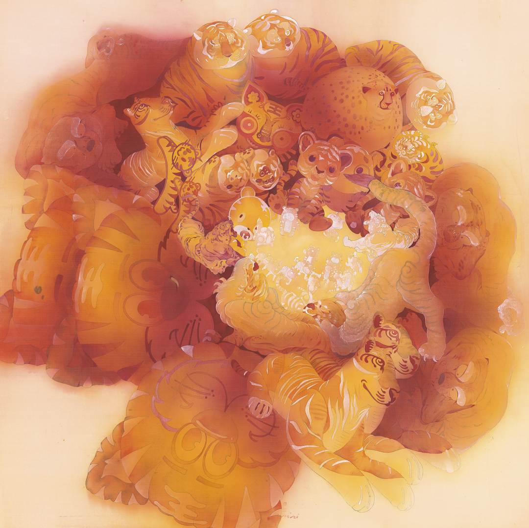 画面远看是盛开的金色牡丹,近看则会发现,构成花朵的元素为形态各异,比比皆是的小老虎们;它们围绕着中心的花蕊嬉闹,风趣诙谐,让人情不自禁的勾起嘴角;画面金色的光彩传递出吉祥与幸福的氛围;一花一世界,艺术家彷佛在表达一个充满禅机的幸福世界。