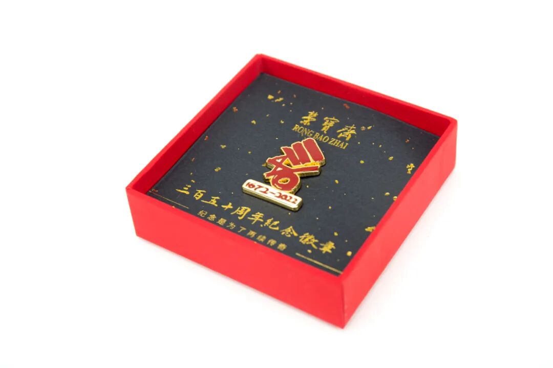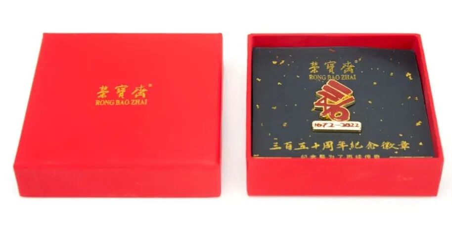 1672年-2022年,历经350年的沧桑巨变,荣宝斋这块金字招牌愈发熠熠生辉。为纪念荣宝斋350周年华诞,荣宝斋文创中心精心制作了“350周年纪念”徽章。徽章选用锌合金材料,重量约5克,长30mm宽20mm厚1.5mm,精巧别致。