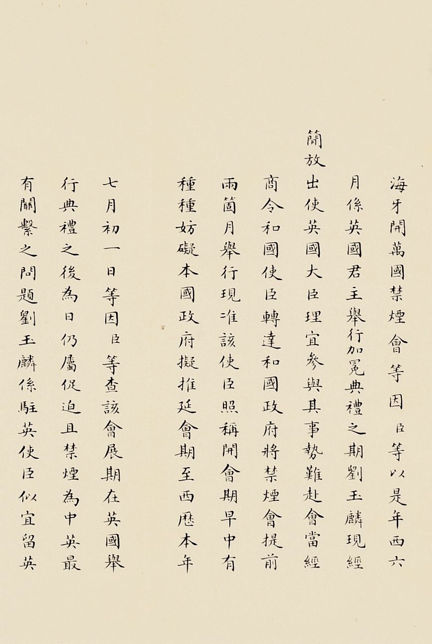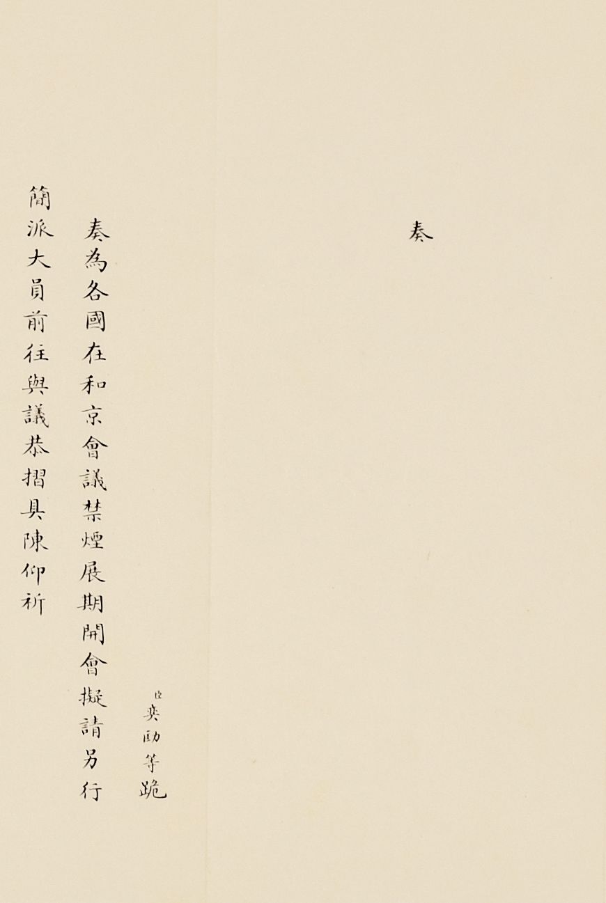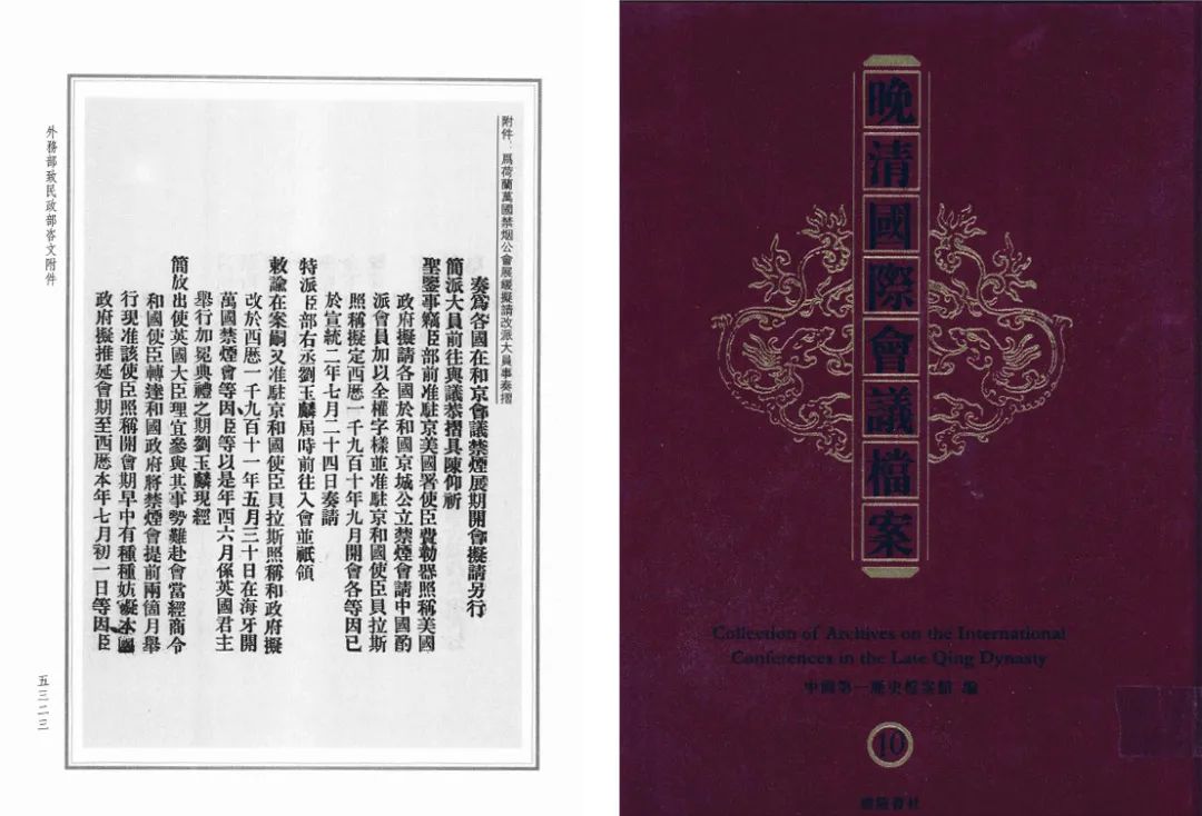 奏为拟请另行简派大员前往合京(荷兰海牙)禁烟会会议折(朱批一处)著录:中国第一历史档案馆编《晚清国际会议档案》,广陵书社,2008年,第十册,第5322-5324页《外务部致民政部咨文:为荷兰禁烟会议展缓拟请改派大员一折现录旨刷奏请钦遵事(附件:为荷兰万国禁烟公会展缓拟请改派大员事奏折)》1911年12月1日禁烟会会议在荷兰首都海牙召开,这场会议对于饱受鸦片之害的中国尤为意义重大,故虽然会期数次延迟,清政府代表与会遭遇种种实际困难,但仍然慨然赴会。会议对于鸦片及其毒品进行了科学定义,重点讨论了如何限制、禁止生产和销售问题,会议结束后草签了《海牙禁止鸦片公约》。![]()