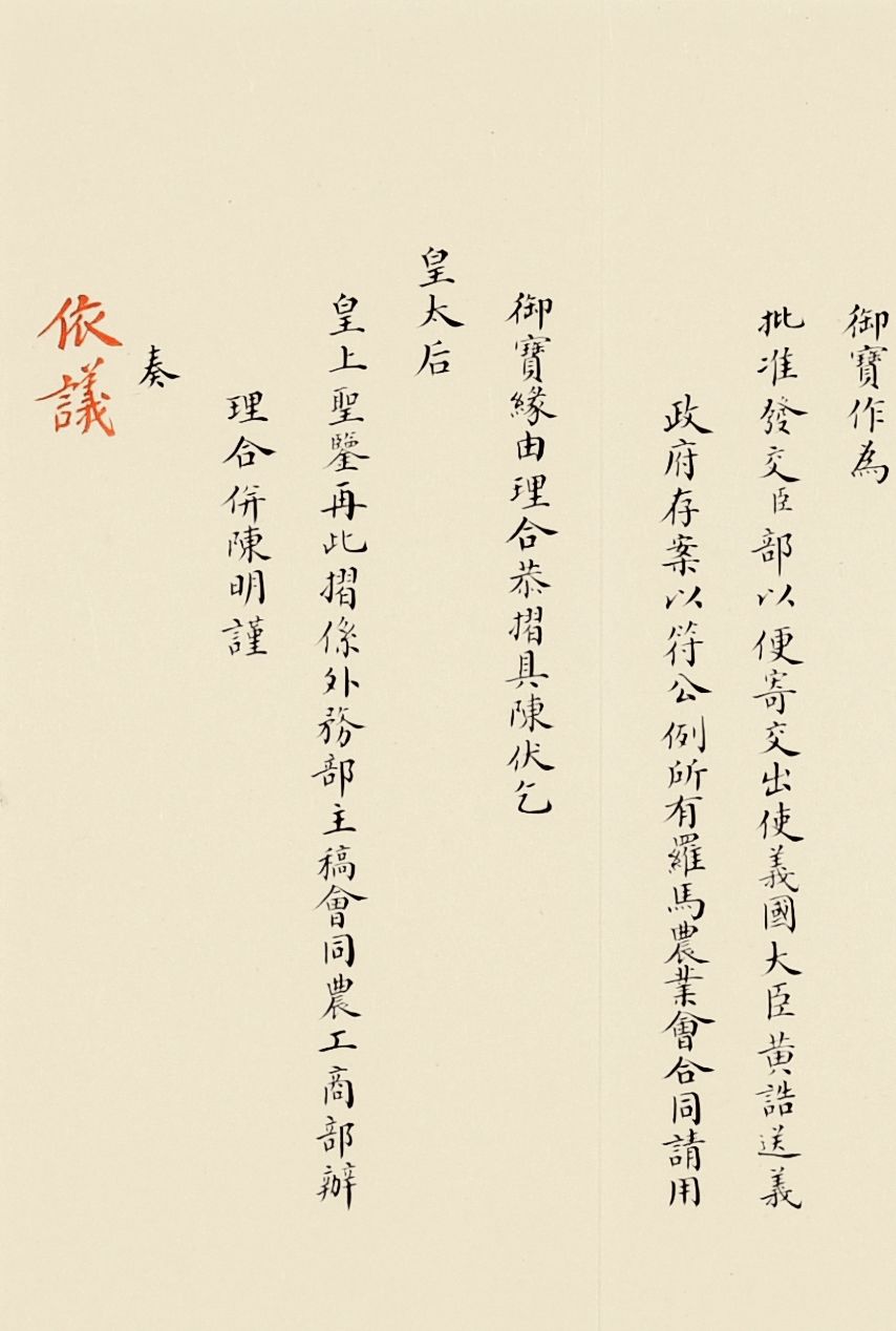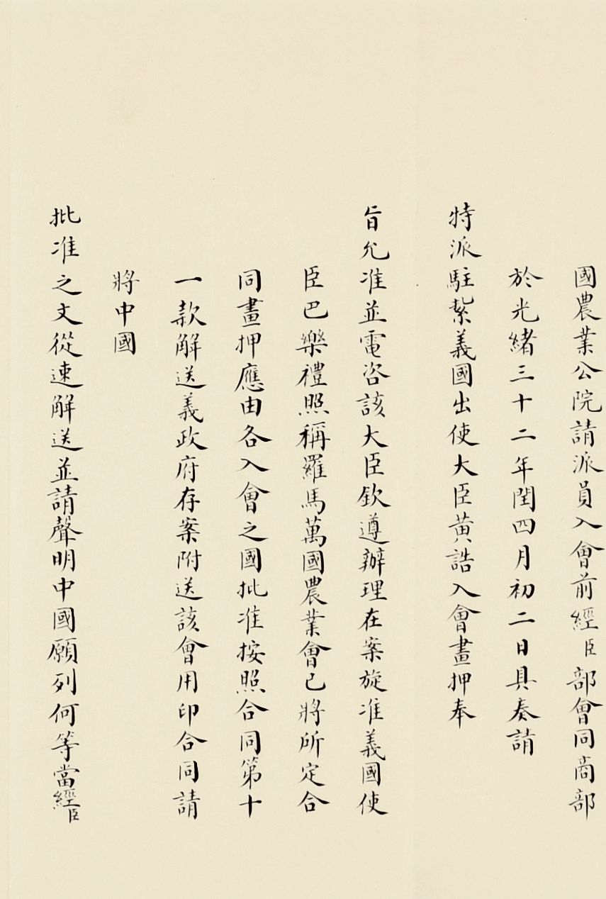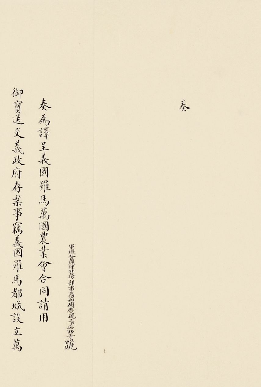 奏为意大利罗马万国农业会合同请用御宝折(朱批一处)清光绪三十三年(1907)写本参阅:中国第一历史档案馆编《晚清国际会议档案》,广陵书社,2008年,第五册,第2864页《农工商部致外务部片呈:为会奏农业会合同请用御宝送交意外交部存案一折本部堂衔并无注写事》合同订立伊始,意大利驻华公使即照会外务部,请清政府派员画押,5月29日出使义国大臣黄诰正式签署文本,11月2日奏请用印批准并送至意大利政府存案。各国在加入万国农业会时可自愿根据会费缴纳额来选择等级,清政府仿照日本,体现了清政府参会目标是追求与日本同等的地区性大国地位。![]()