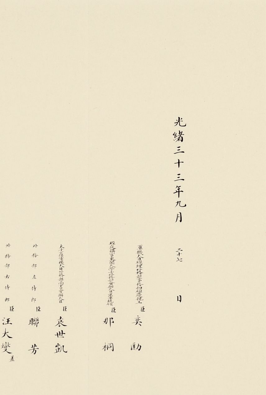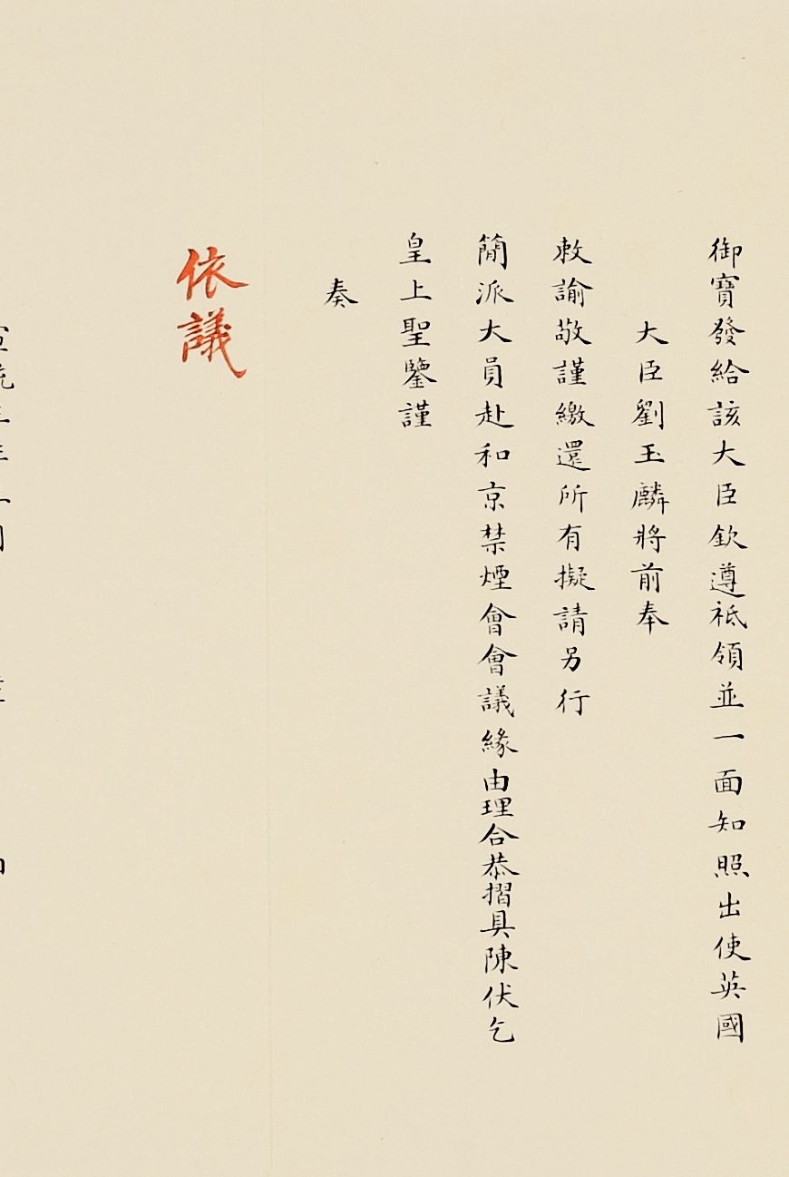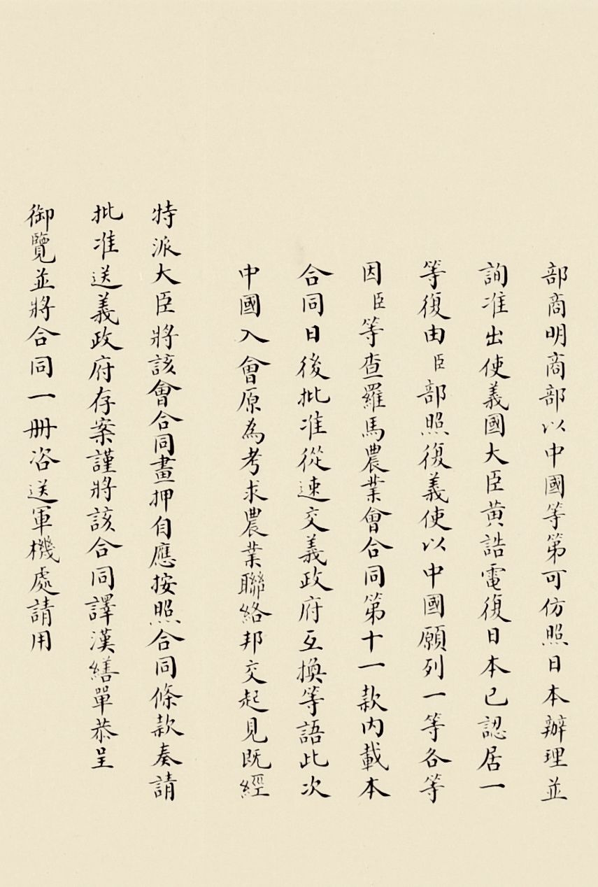 奏为意大利罗马万国农业会合同请用御宝折(朱批一处)清光绪三十三年(1907)写本参阅:中国第一历史档案馆编《晚清国际会议档案》,广陵书社,2008年,第五册,第2864页《农工商部致外务部片呈:为会奏农业会合同请用御宝送交意外交部存案一折本部堂衔并无注写事》合同订立伊始,意大利驻华公使即照会外务部,请清政府派员画押,5月29日出使义国大臣黄诰正式签署文本,11月2日奏请用印批准并送至意大利政府存案。各国在加入万国农业会时可自愿根据会费缴纳额来选择等级,清政府仿照日本,体现了清政府参会目标是追求与日本同等的地区性大国地位。![]()