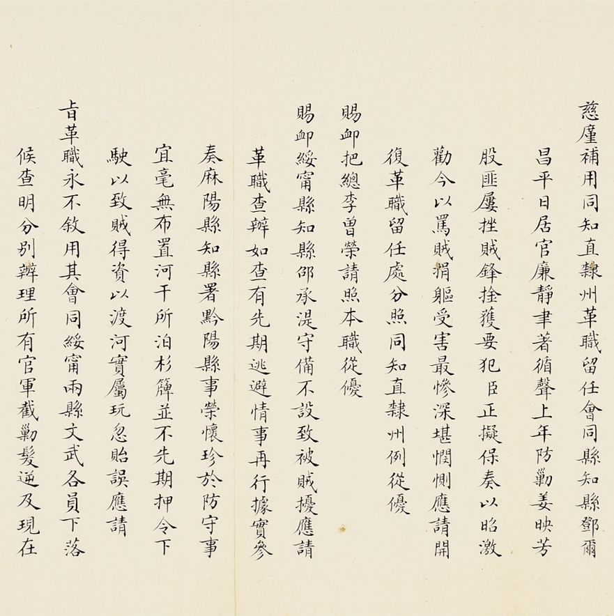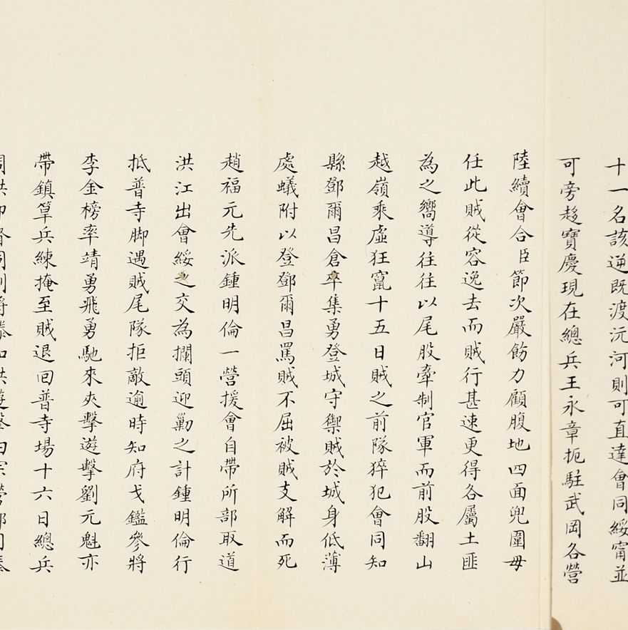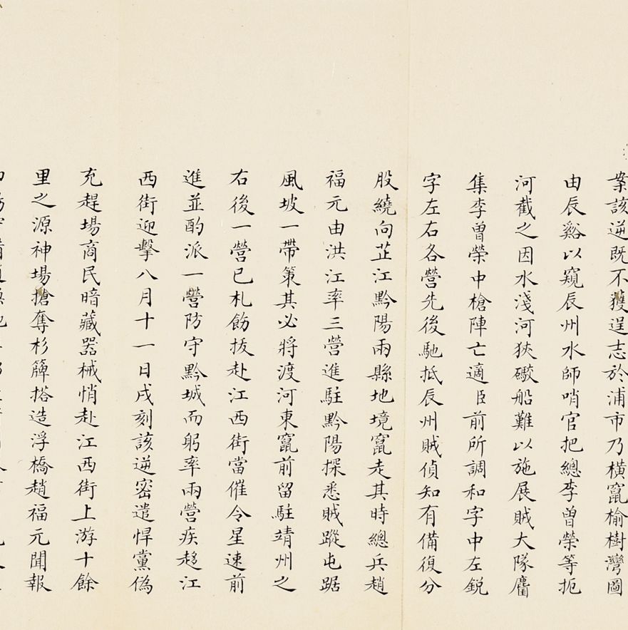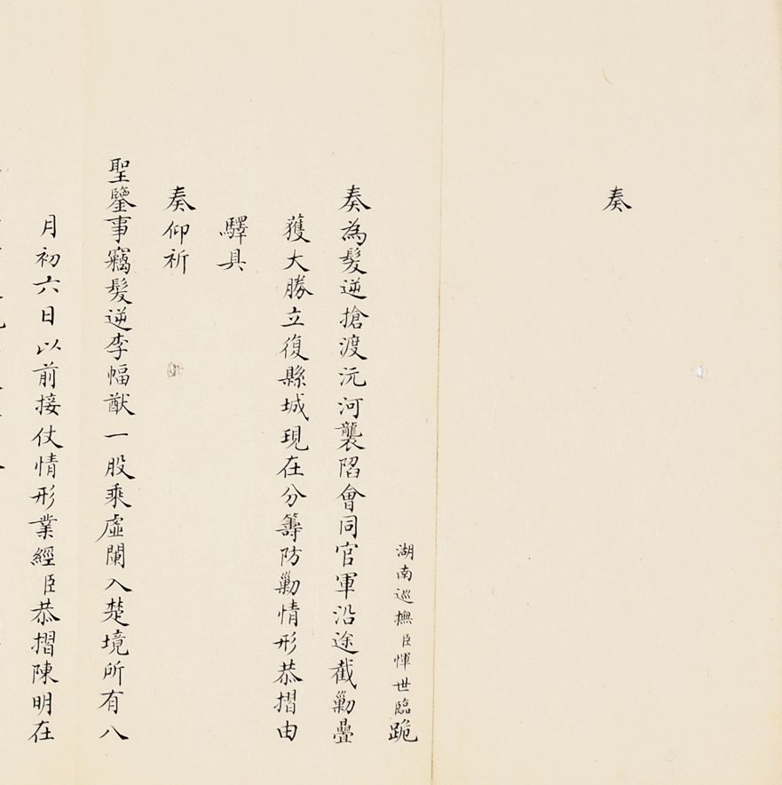 奏为会商抽收海关提单捐、轮舟火车客票捐折(朱批一处)是折长度达18扣,系由外务部主稿,会同商部、户部办理折,系外务部奕劻、瞿鸿禨、那桐、联芳、伍廷芳,并商部载振、陈璧、顾肇新,并户部王文韶、荣庆、鹿传霖、赵尔巽、景澧、陈邦瑞、增崇、戴鸿慈等奏为安徽巡抚诚勋奏请抽收海关提单捐、轮舟火车客票捐折。此外,此次奏折系列中,还有一条主线,即同治初期湖南巡抚恽世临(1817-1871)奏报剿灭太平天国残部、捻军以及湖南边境苗民起义等事件。清同治二年(1863)太平军石达开在四川大渡河失败后,其流散部队李幅猷万余人转战川黔边境,拟绕道湖南,仍回江西。李幅猷在榆树湾击败清军驻防水师,挺入黔阳县境,夜渡沅水,进驻托口。九月二十七日进抵会同县城,太平军攀台而上,阵斩邓尔昌,占领县城。二十八、二十九日清军总兵周洪印督同各军,分五路围攻太平军,太平军败退撤出城外。是折1折24扣,详述战斗与太平军残部情形,内如“会同知县邓尔昌仓猝集勇登城守御贼于城,身低薄处蚁附以登邓尔昌骂贼不屈,被贼支解而死”等惨烈战况描述。