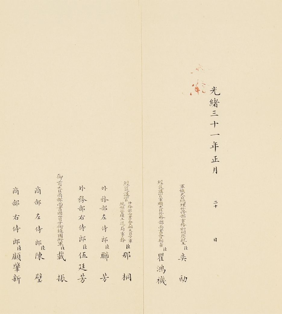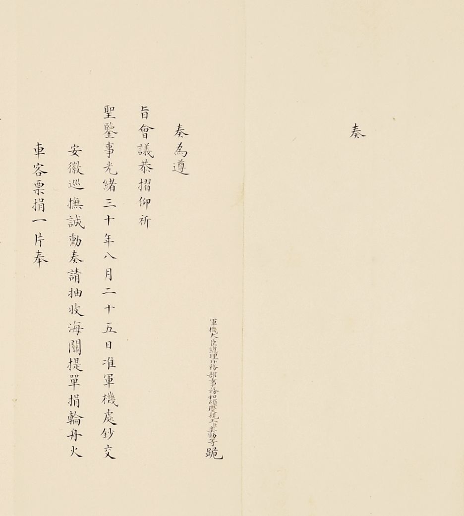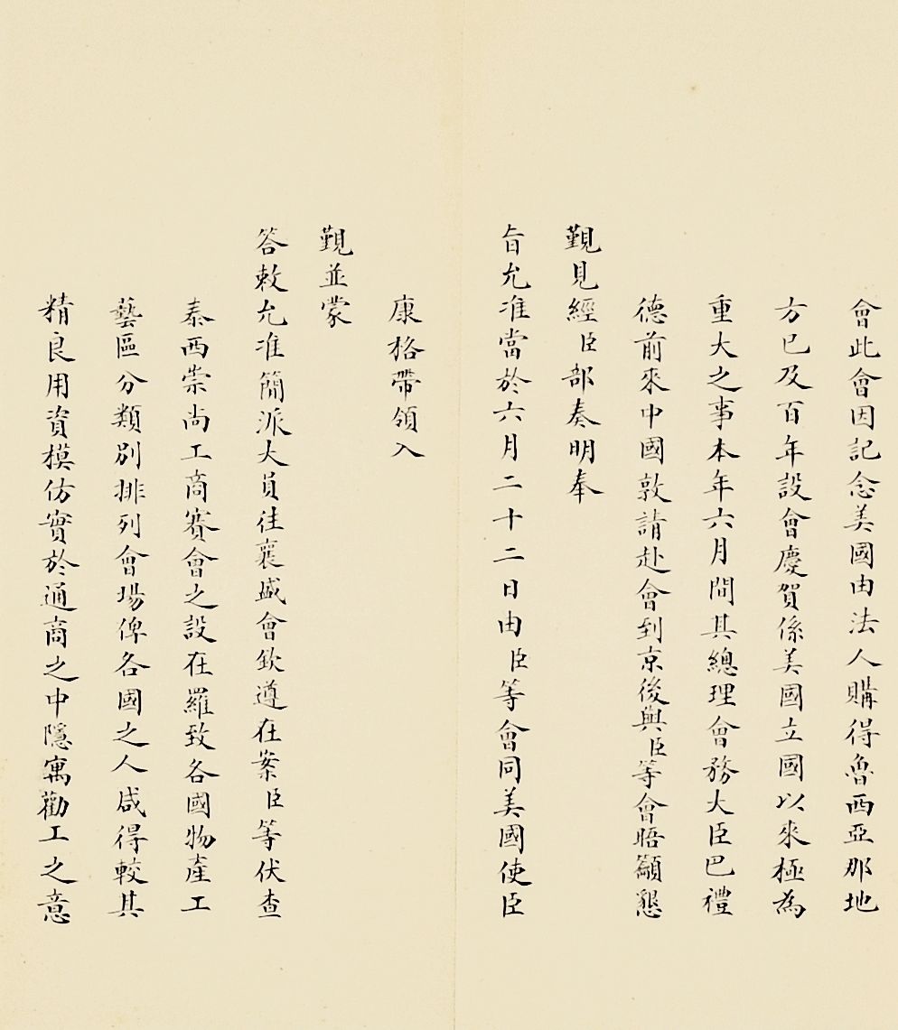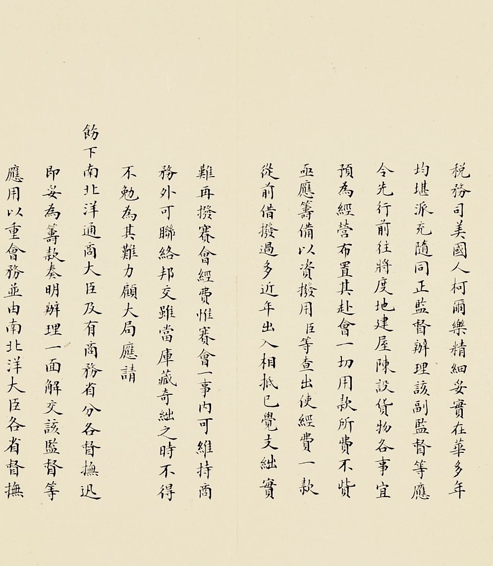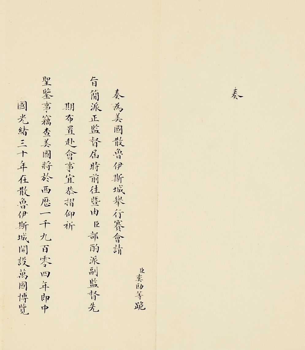 Lot 2752至Lot 2773以奏折为载体,以晚清宗室重臣爱新觉罗·奕劻(1838-1917)为主线,包括晚清中国国际交往的各个方面。奕劻为清朝首任内阁总理大臣,亦为清王朝最后一个“铁帽子王”,身份履历相当具有传奇性,因奕劻总理外交,所以此批奏折涵盖了美国圣路易斯世界博览会、荷兰海牙国际禁烟会议、上海商约所以及中国驻美大使馆馆舍兴建、出使各国大臣造报经费支出等各个方面,为近代晚清外交缩影。此外,同治初期湖南巡抚恽世临(1817-1871)奏折主要为奏报剿灭太平天国残部、捻军以及湖南边境苗民起义等事件,也记录了咸丰朝末期、同治朝初期剧烈社会变动下的军事攻防战。爱新觉罗·奕劻(1838-1917),满洲镶蓝旗人。清高宗爱新觉罗·弘历曾孙,晚清宗室重臣。清光绪十年(1884)任总理各国事务衙门大臣,进庆郡王。光绪二十四年(1898年)加恩世袭罔替,成为铁帽子王。清光绪二十九年(1903)任首席军机大臣,仍总理外务部。宣统三年(1911)裁撤军机处,改设内阁,为首任内阁总理大臣。因奕劻总理外务衙门,故其所上奏折多与近代中国外交相关,记录了近代中国尝试加入国际社会的努力,这其中,以清廷筹备参与数次国际性外交会议最为引人瞩目。1904年美国政府为纪念从法国购买路易斯安那100周年,决定在圣路易斯举办世界博览会,1902年美国方面派出公使巴礼德前往亚洲各地游说,盛宣怀、刘坤一、张之洞共同接待了巴礼德,并安排巴礼德觐见慈禧太后。清廷在赴会代表团人选方面斟酌再三,最终选派溥伦为正监督,并派黄开甲、美国人柯尔乐为副监督参会。