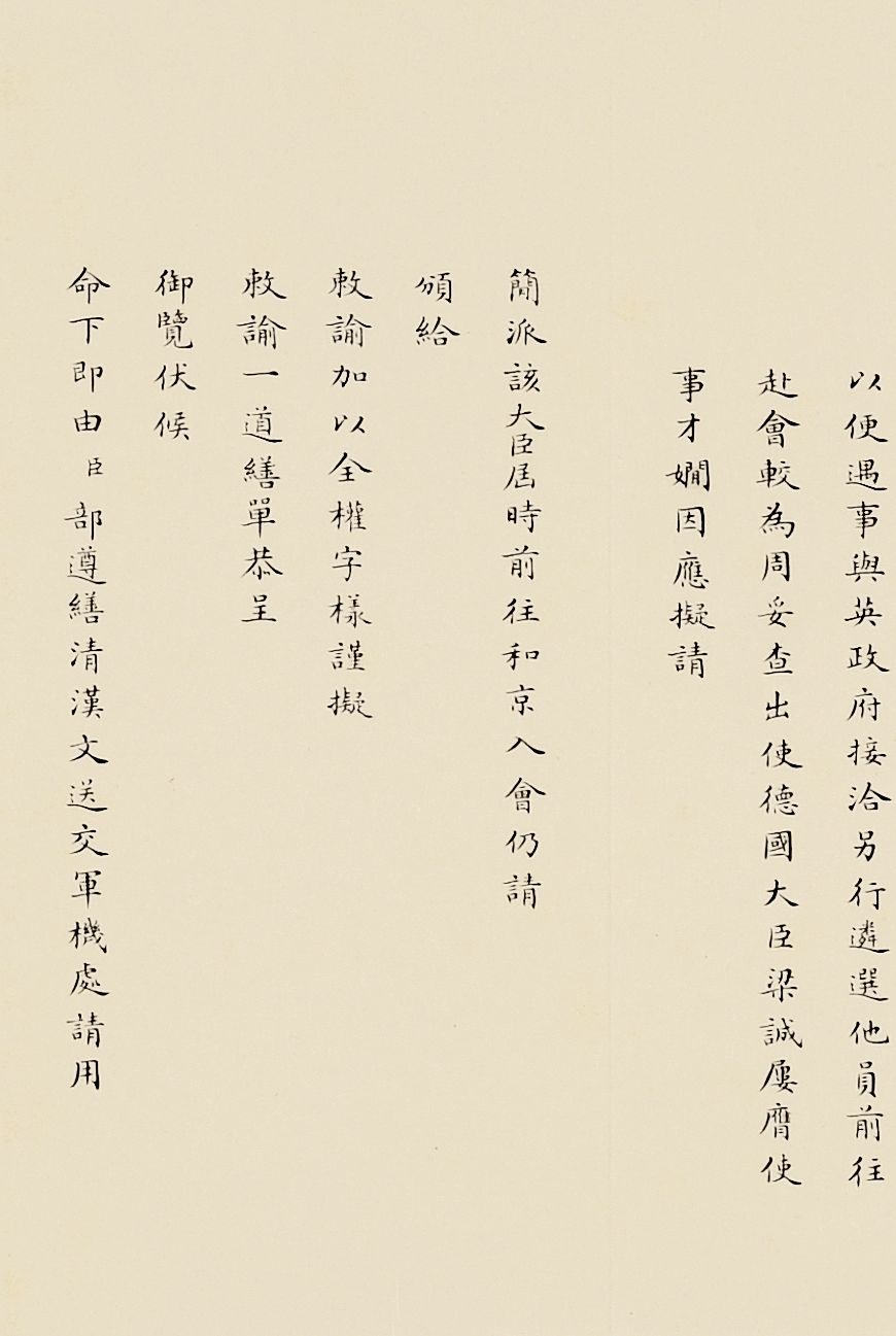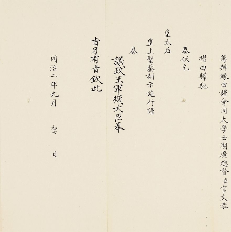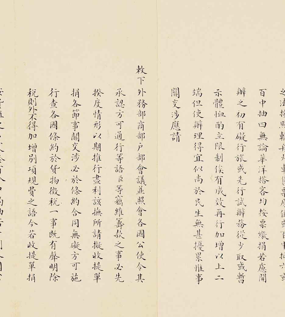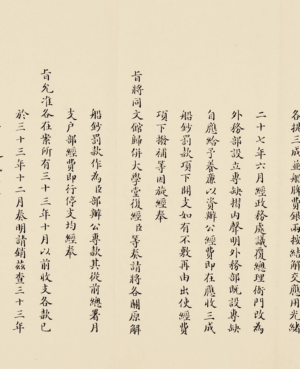 课程开始时只设英文,由英国传教士包尔腾任教习,后来增设法文、德文、俄文、日文。美国传教士丁韪良总管校务近三十年。光绪二十七年十二月(1902年1月),并入京师大学堂,改名京师译学馆,并于次年开学,仍为外国语言文字专门学校。由于总理衙门(后称外务部)掌管全国关税系统,关税作为清政府后期一个全新的收入来源,成为弥补政府财政收入的主要来源。在增加关税、分配关税使用渠道时,外务部往往需要会同户部、商部等共同办理,所以这类会同办理奏折往往形制更加完整,内容丰富,规制性极强。