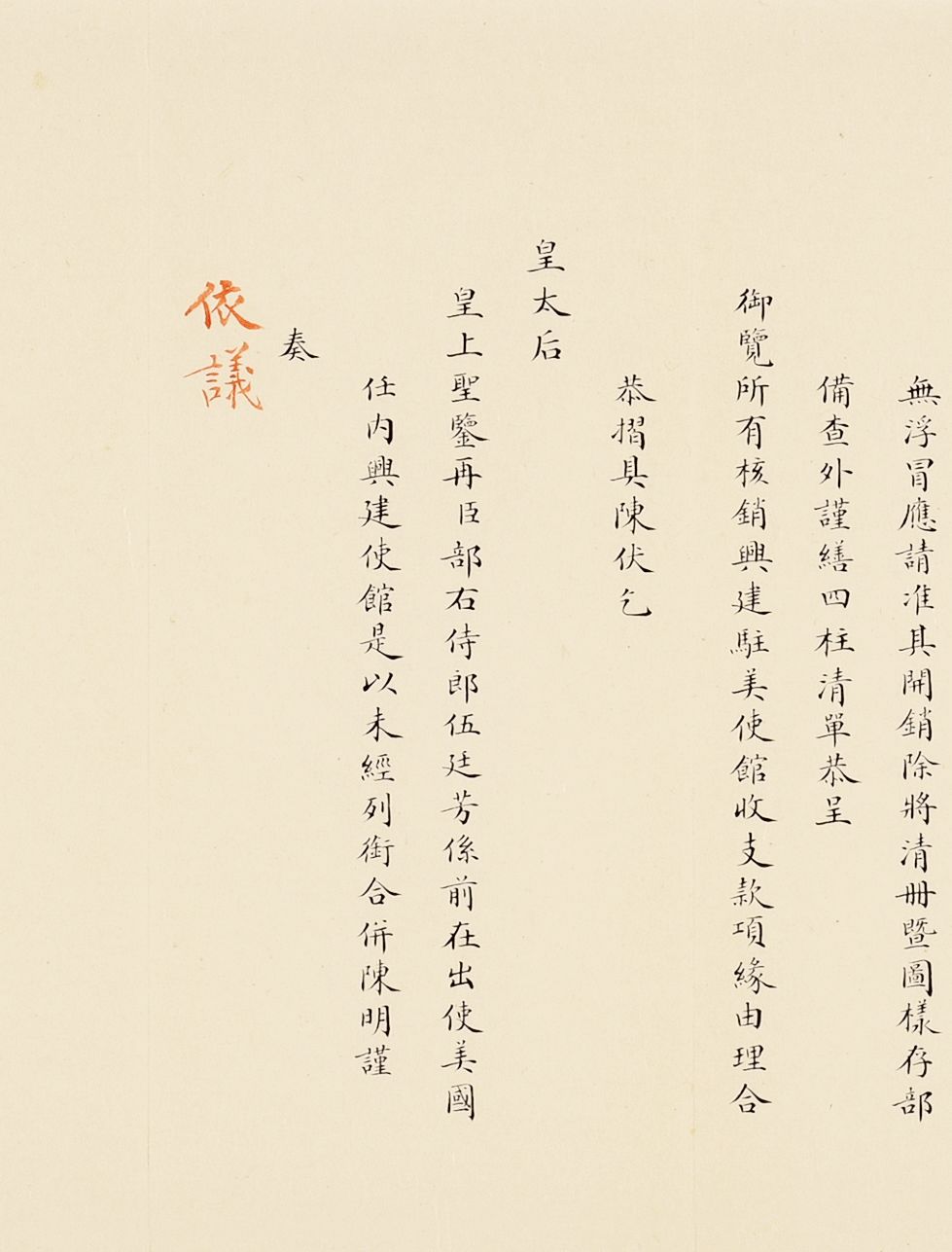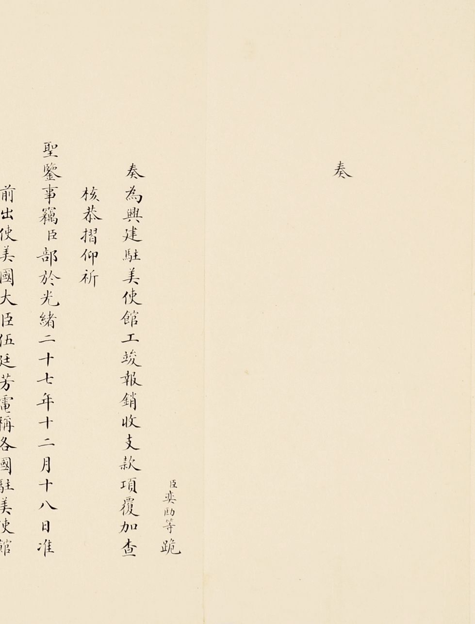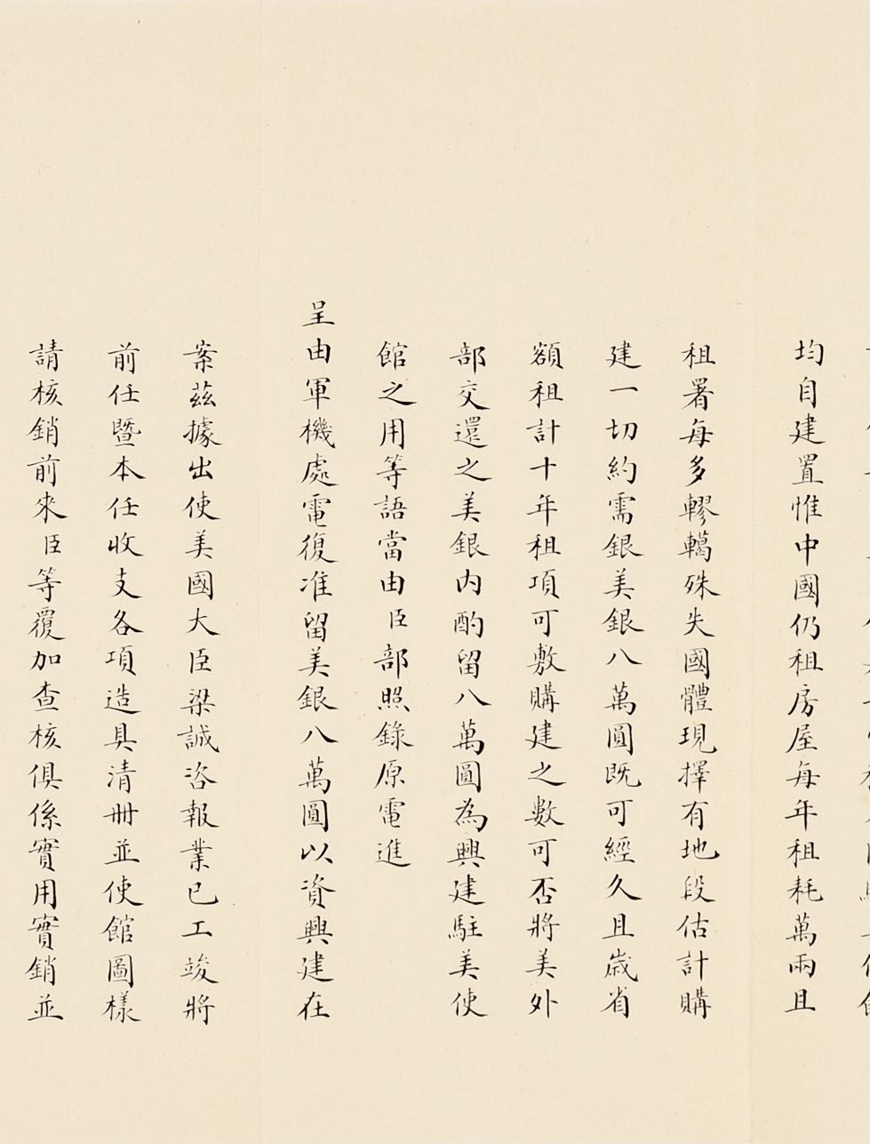 在国际交往中,外交使领馆的修建,往往是国家综合外交实力的体现,故清廷外交部对驻外使领馆修建亦特别关注。清政府派遣美国使团以来,馆舍均租用当地民房作为使署,月租额需美银500元,每年总计约库平银一万两,耗费巨大。驻美公使伍廷芳在任内选择地段,并追索庚子之变美国掠去津库纹银三十七万两中之一部分,共计八万两,用于修建新使馆,于光绪二十八年(1902)开工,历时一年,在新任驻美公使梁诚到任后竣工。此次征集所得亦有总理事务衙门下辖京师大学堂、京师同文馆的珍贵史料。京师同文馆是清末第一所官办外语专门学校,由恭亲王奕訢及文祥于咸丰十年十二月(1861年1月)奏请开办,初以培养外语翻译、洋务人才为目的,属总理事务衙门。