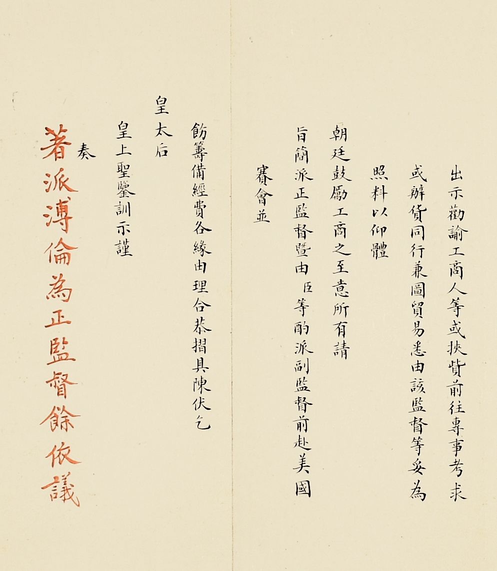 奏为美国圣路易斯世界博览会简派正副监督前往事折及片(朱批二处)1、中国第一历史档案馆编《光绪朝朱批奏折(第一百一十二辑·外交)》,中华书局,1996年,第120页《光绪二十九年三月初五日溥伦折》2、中国第一历史档案馆编《清宫万国博览会档案》,广陵书社,2007年,第177-192页《外务部致美国驻华公使康格照会:为奉旨派溥伦充任赴美赛会正监督请查照事》、《外务部奏折:为请旨简派赛会正监督并已令黄开甲柯尔乐充任副监督先行赴美事》等此次征集所得《奏为美国圣路易斯世界博览会简派正副监督前往事折及片(朱批二处)》即为原始档案,内有光绪皇帝朱批十一字,字字珠玑,在国内拍卖市场中,有如此之完整朱批的奏折异常罕见。爱新觉罗·溥伦(1874-1927),字彝庵,爱新觉罗氏,满洲镶红旗。清高宗弘历五世孙,时称伦贝子。1904年3月4日率代表团离京出席美国圣路易斯世界博览会,回国后受到重用,任资政院总裁、农工商大臣,是宣统年间皇族内阁重要成员之一。![]()