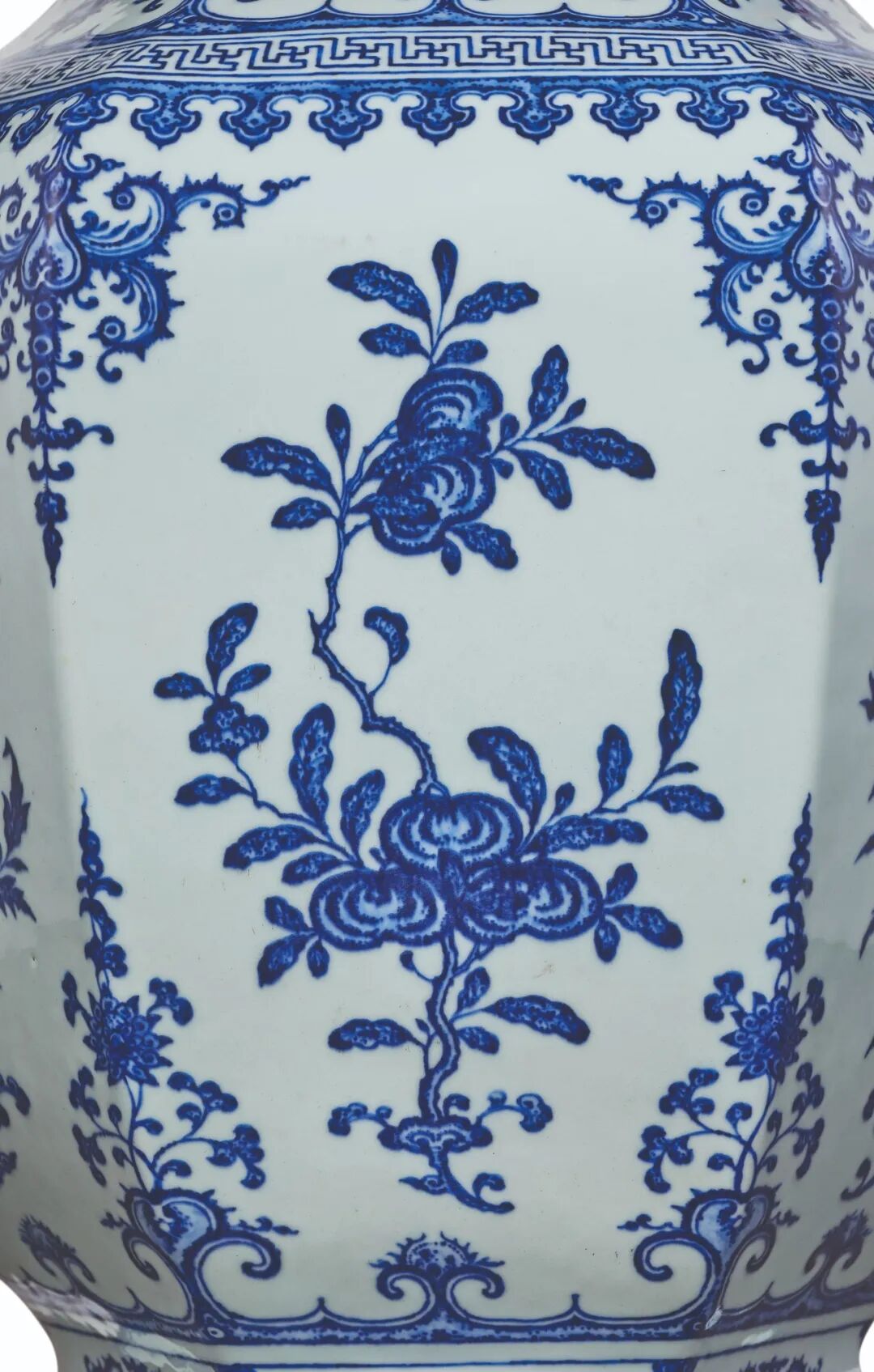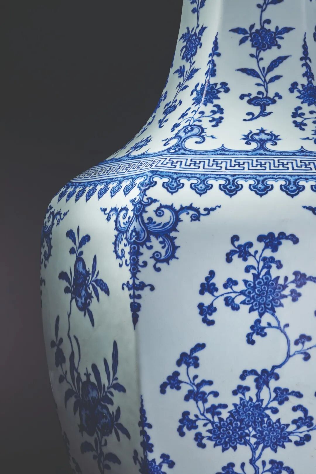 本六方大尊造型敦硕,兼之釉下青花浓艳、画工精妙,观之气派非凡。瓶体呈六方形,撇口,长颈,折肩,弧腹,圈足微外撇。通体以青花为饰,自上而下分别绘以回纹、卷草纹、折枝花卉纹、万字纹、如意云头纹、朵花纹。腹部主题纹饰在六面分别绘有石榴、菊花、柿子、牡丹、桃实、莲花六种花果。六道棱线分别绘以西洋巴洛克式卷草纹,上下呼应。独立学者暨故宫陶瓷研究所客座研究员苏玫瑰(Rosemary Scott)指出,此大尊有着效果尤为出众的中西合璧纹饰。“器身的折枝花果纹与十五世纪上品青花明瓷遥相呼应,并辅以灵芝纹,其间绘西式缠枝图案。”她表示。