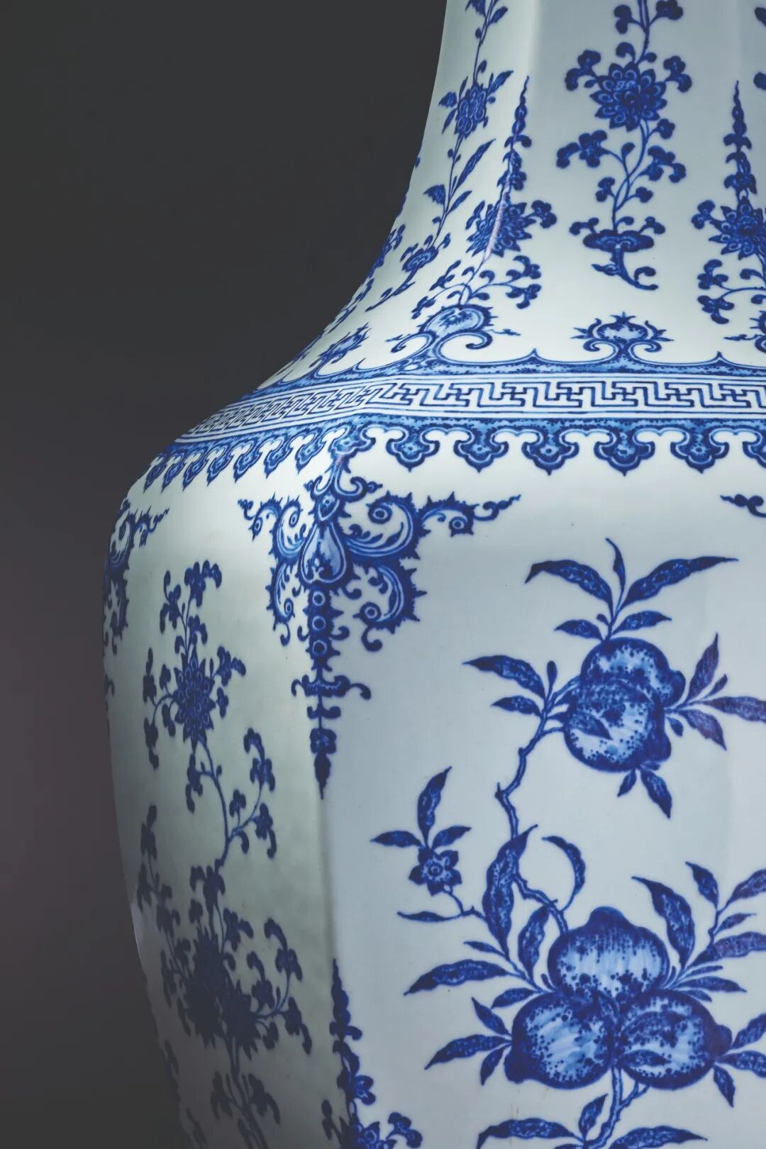 此六方大尊口沿起六条棱线,下延至底足,对陶工而言烧造难度极大。所有棱面器物,均存在窑烧时棱面折角易裂的难题,本拍品器型如斯敦硕,因此问题愈加明显。陶工必须确保所有棱面厚薄一致、严丝合缝,方能避免窑烧之际开裂变形。直到十八世纪,御窑的青花和单色釉棱面瓷器数量大增,足证当时的窑烧技术已臻上乘。“此等佳妙之作应是为装点宫廷而烧制的御瓷,北京紫禁城储秀宫内仍有一对近似的六方尊;另一近似例为南京博物院珍藏。而松冈美术馆藏中也有一例六方尊。” 苏玫瑰表示,“拍场上亮相的近似例寥寥可数,香港佳士得曾于1998年4月27日拍出一例,其形状、大小与纹饰俱与本拍品十分接近,现为庄绍绥先生珍藏。”