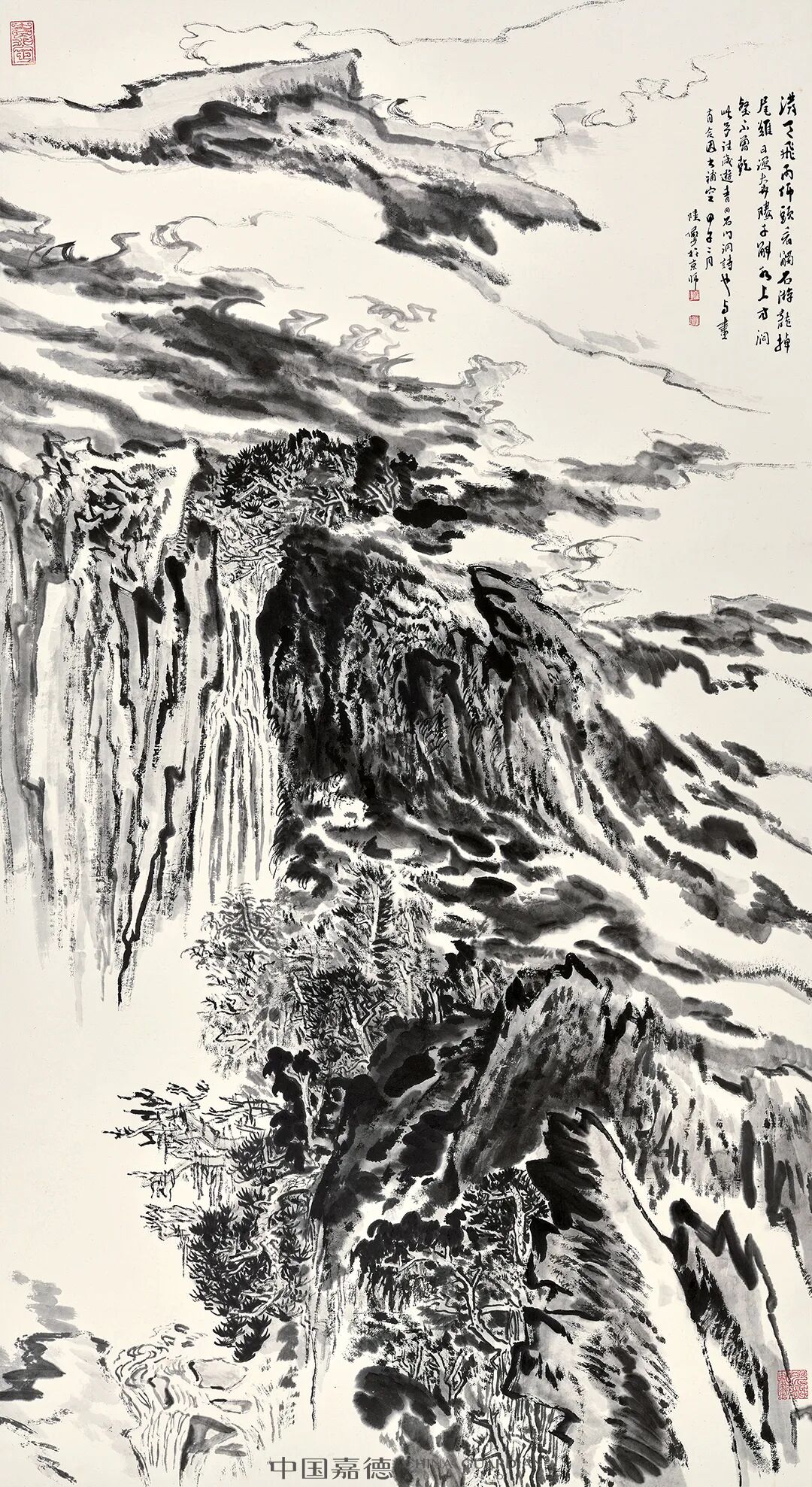 陆俨少壬戌浙游的第一站便是婺瓯之间的青田石门洞,感于此地风景钟秀,陆俨少画了大量的写生稿,并有诗记之。其中之一言“泼天飞雨仰头看,触石游龙掉尾难。日泻奔腾千斛水,上方涧壑不曾干” 。此诗以泼天飞雨开篇,写尽石门洞洞天飞瀑的气势撼人。二岁后,甲子年俨少忆此七绝,遂作墨笔山水大轴,并题此七绝于上补空,亦即此《泼天飞雨图》轴。