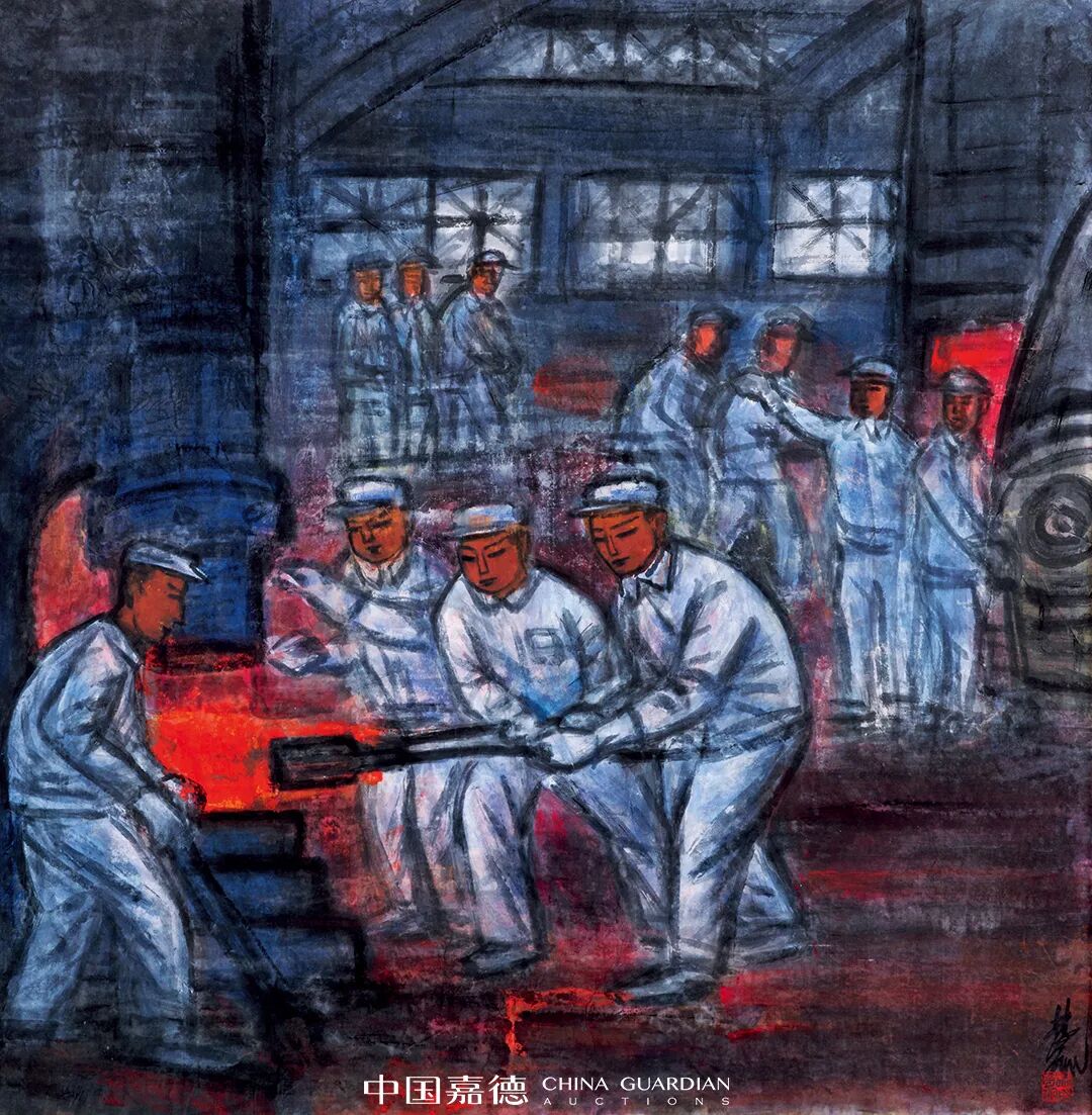 赵文俊(现代)题签条:冶炼图。林风眠作。此图大约林氏曾在川沙上钢三厂参观后所绘,时间为五十年代末至六十年代初,正值全国大炼钢铁、以钢为纲时期。赵文俊题记于沪上无逸阁。