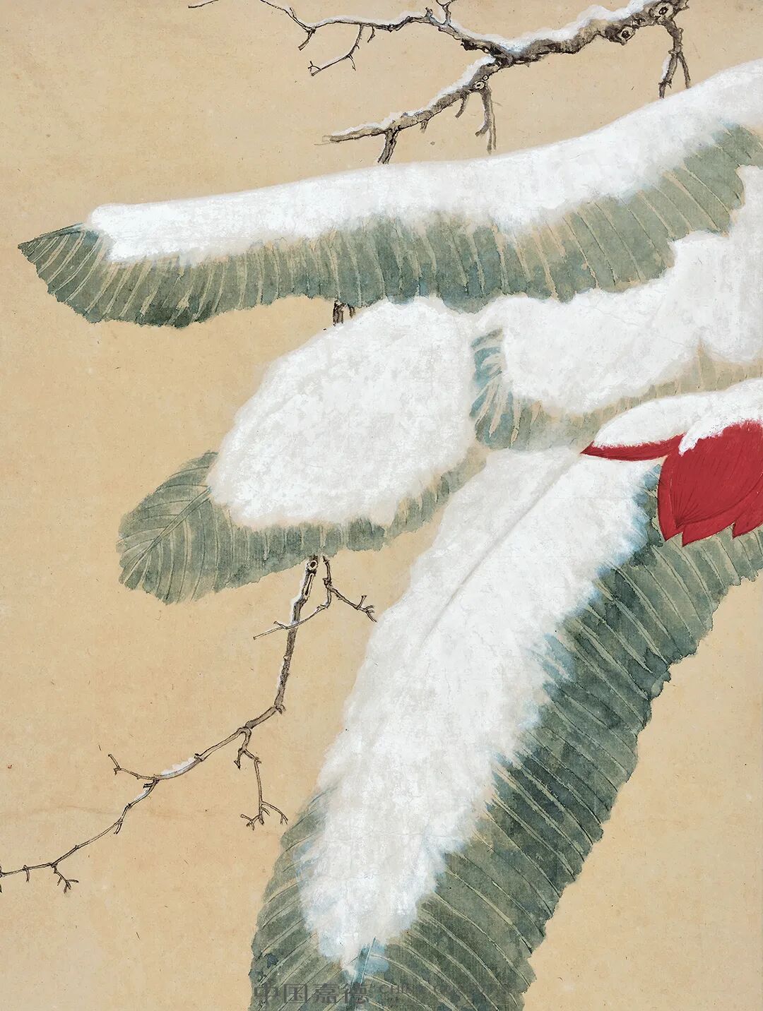 但见图中,右上角延伸出来的蕉叶,被皑皑白雪所覆盖,斜出至左下,这是典型的宋人“折枝式”构图。阔大的蕉叶受压后向下弯坠,并露出后方的秃枝,从而形成前后虚实相应的位置关系。