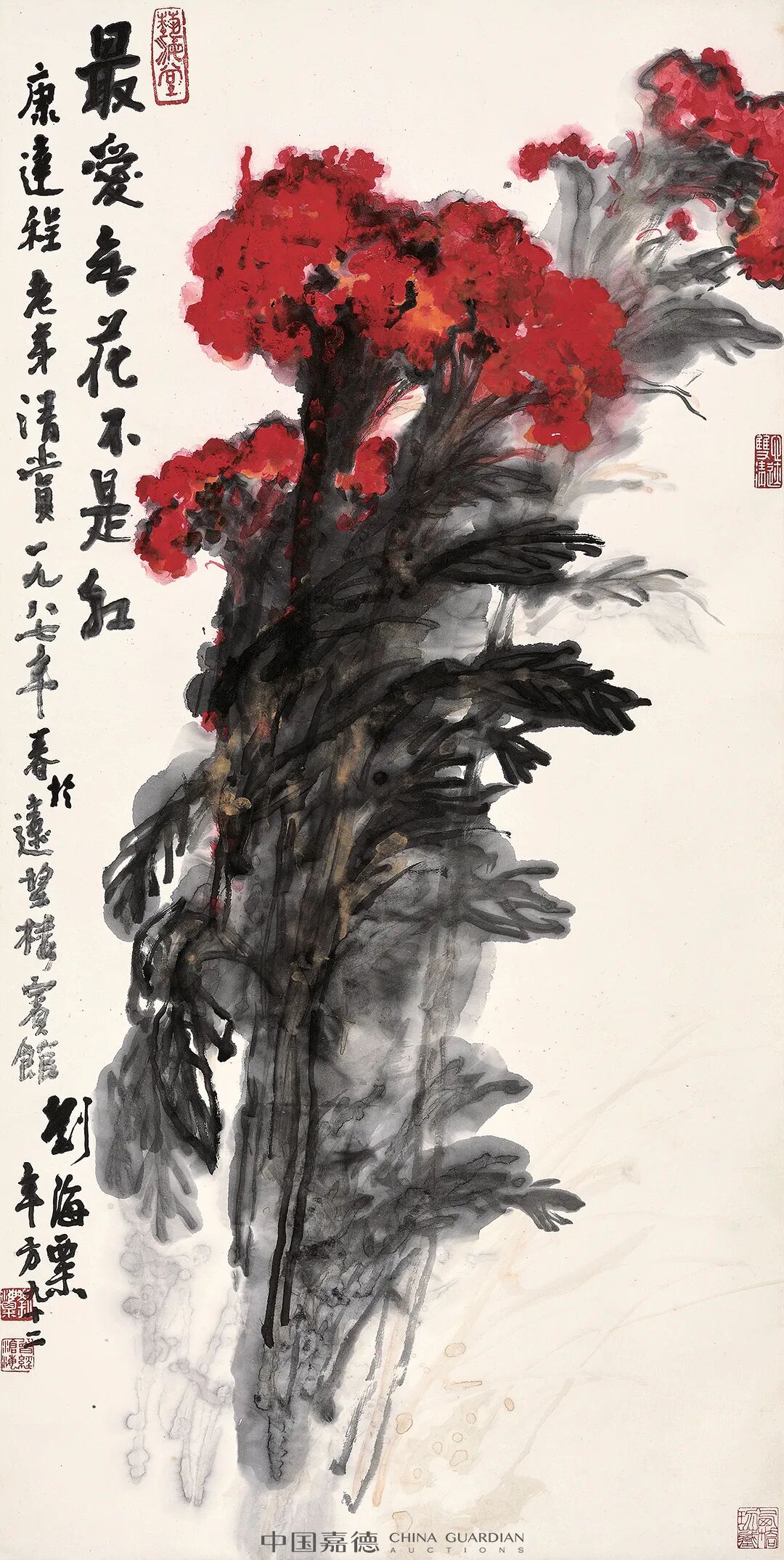 1987年,刘海粟赴京开会,便下榻于远望楼宾馆。会议之余,刘海粟与弟子及慕名而来的求艺者探讨书画,期间留下不少丹青墨宝。本幅《最爱无花不是红》,便画于此时。