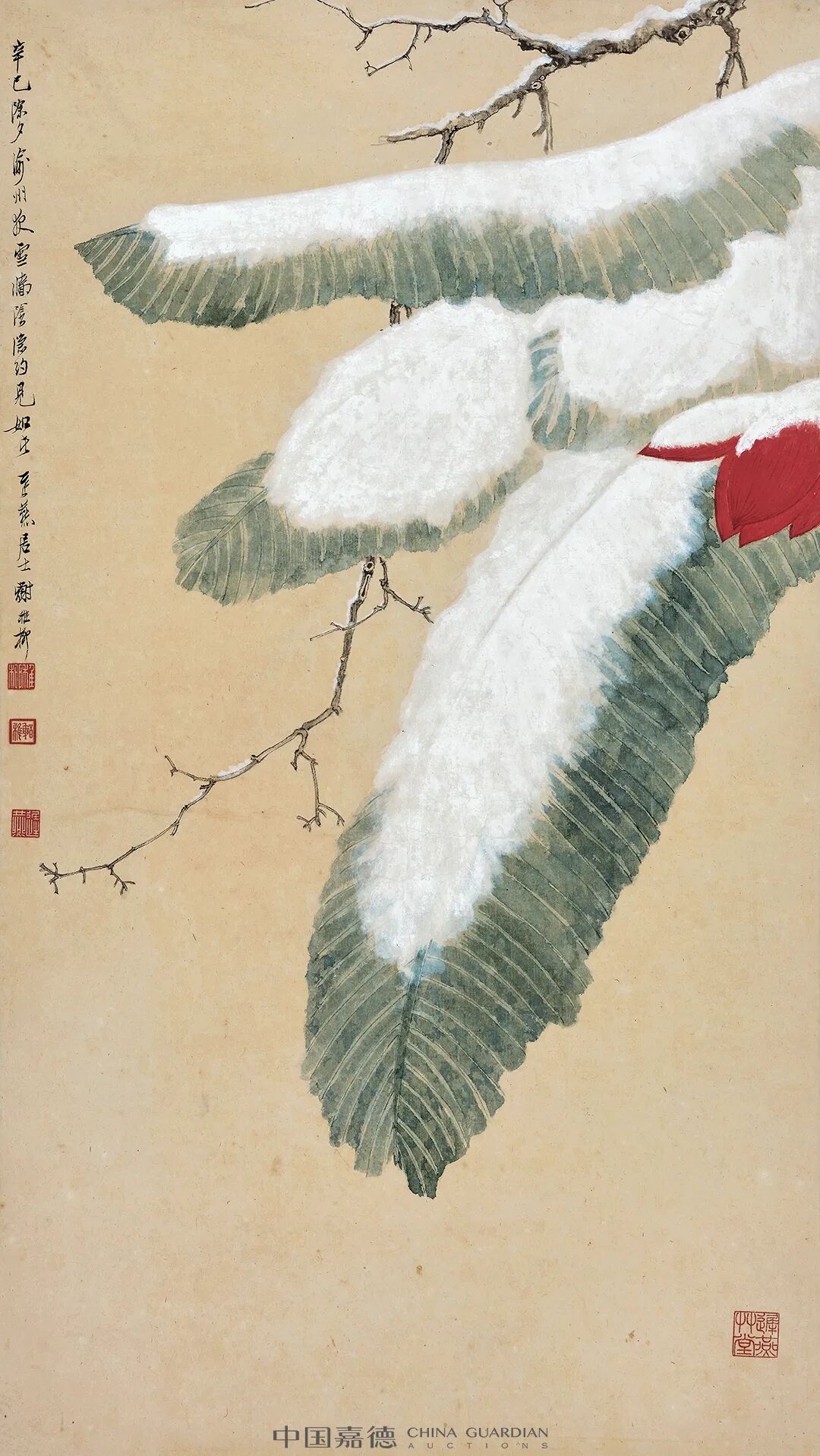 据款识所记,此图为谢稚柳隐约看到微暗夜雪和月光映照下墙角雪压蕉叶红花的奇妙幻象,遂即以画笔记录而成。取材为自己的视觉经验,捕捉了一刹那的景象,融合了肉眼所见及内心情感,构成了令人神往的景象。这种点滴,便是此幅自然造化的基因。