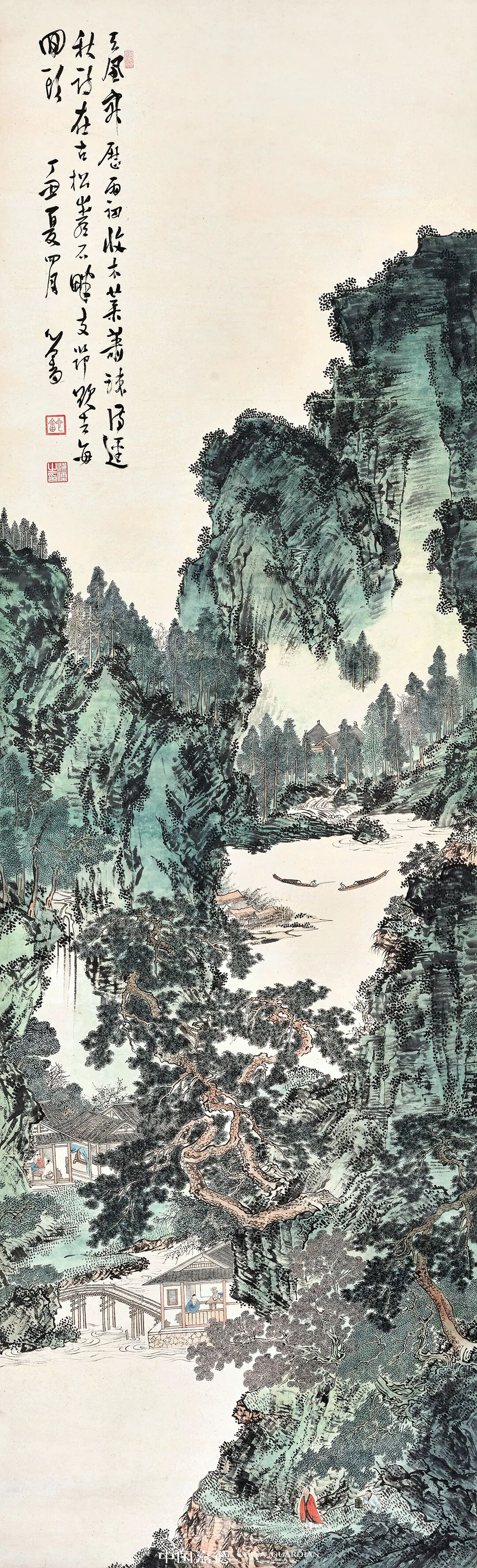 题识:天风寂历雨初收,木叶萧疏满径秋。诗在古松岩石畔,支筇欲去每回头。丁丑夏四月,心畬。