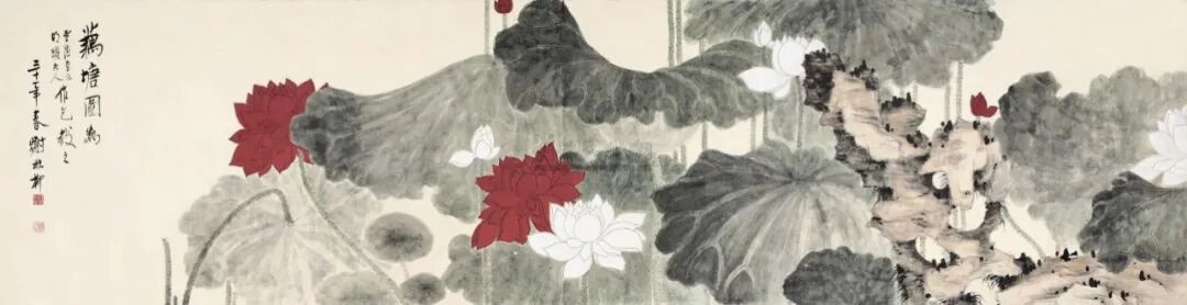 画右,一朵红艳探出,以色勾形,复以赤烘染,其质饱满。红花布局之法,显然取自老莲奇崛之法,而丰腴秀丽之态,则完全是宋人法度。这是谢稚柳在师古人过程中的选择与取舍,昭示出其笔下气息由明而宋的端倪,充分反映了谢稚柳的个性与审美。
