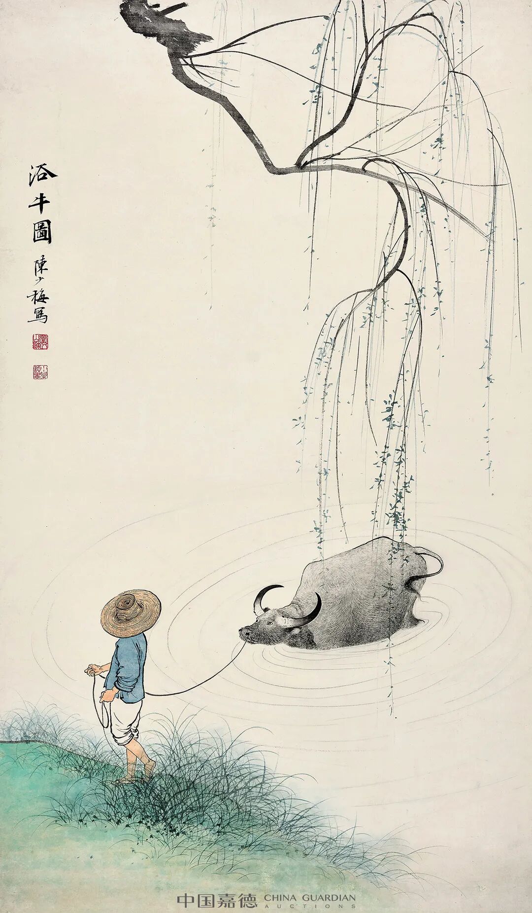 新中国的成立,标志着文学艺术创作进入了一个崭新的历史时期。经历了旧时代的艰辛历程,又对新生活充满热忱的陈少梅,已不能安守既有的成绩,深深感到形式、内容全面更新的必要性和迫切性。除了创作《小姑山》、《江南春》等新山水画之外与,他也在尝试人物画的创新。这件清新怡人的《浴牛图》便是陈少梅非常成功的创制。