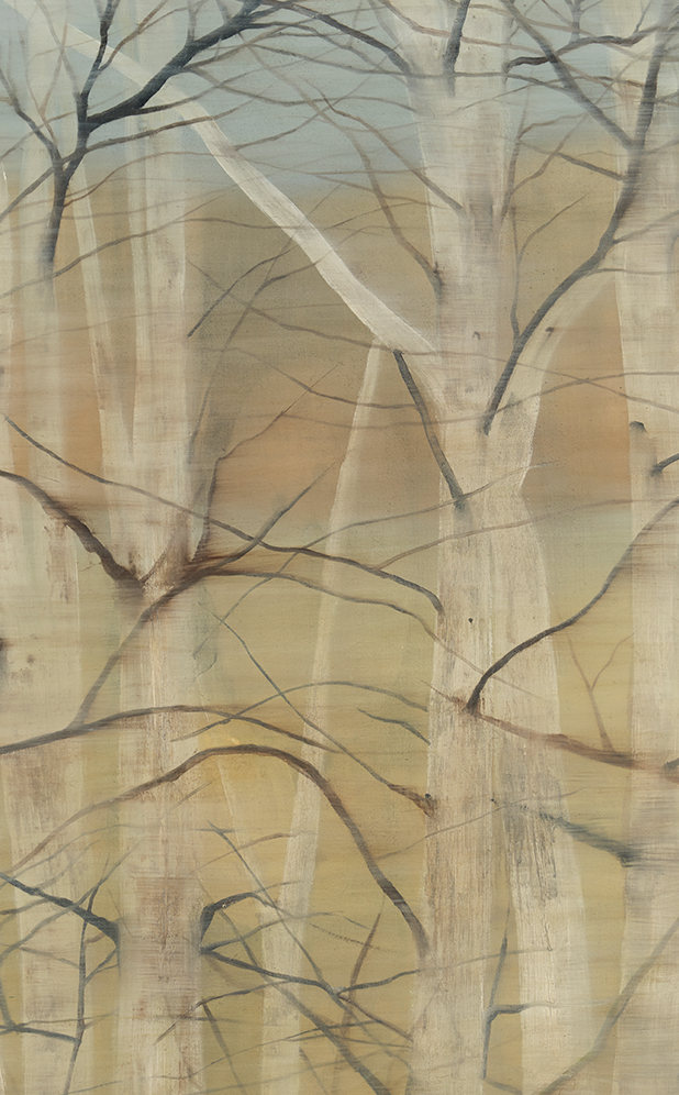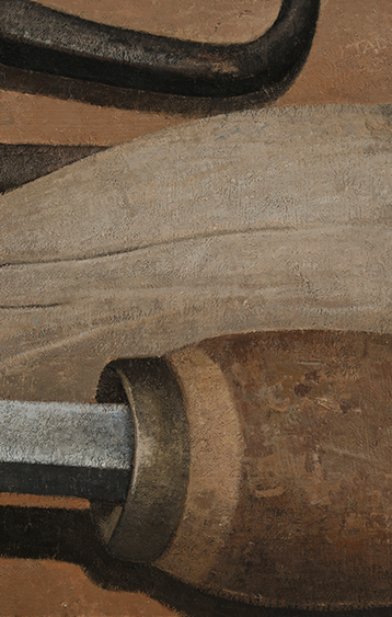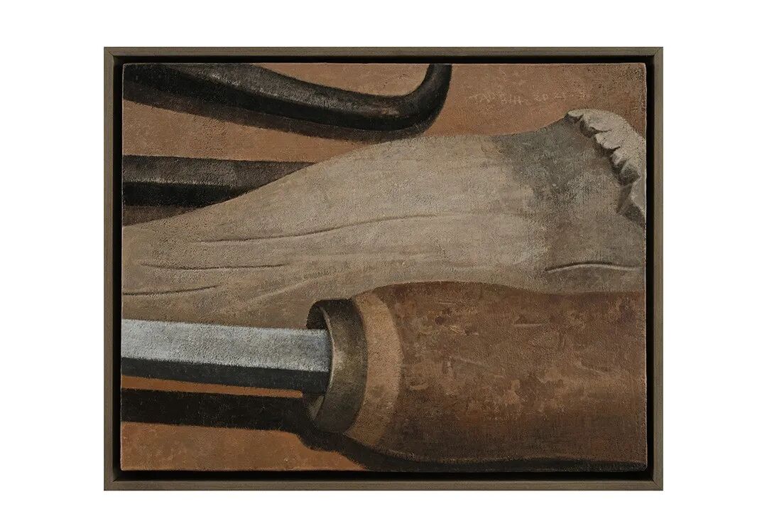 “我在自制的背板上用黄泥和着白水泥做了类似墙面的底子,板面接触起来更坚硬,没有弹性。它们给予身体的这种反应,更贴合那些农具从情感上给我的触动。我把它们的局部放大来描绘。尽可能的削弱掉它们作为一件“农具”这个身份所给出的引导。然后具体的呈现一个物质本身的质感。由此目的所导致的方法其实是非绘画性的,它们更具图像性。”