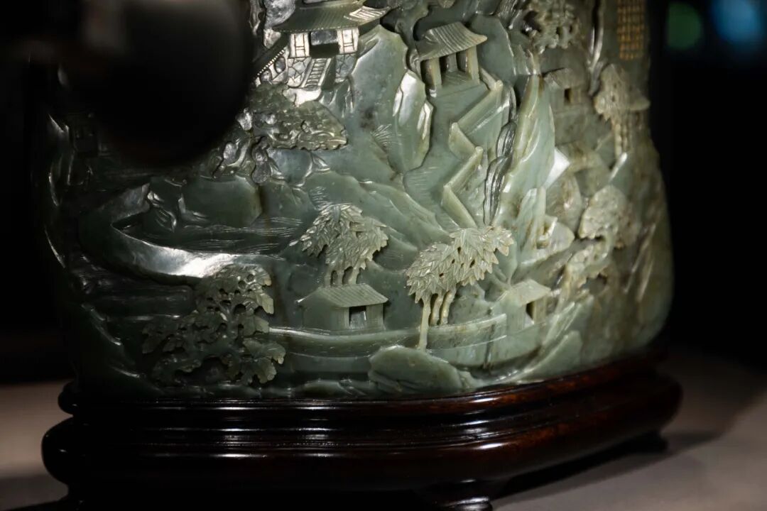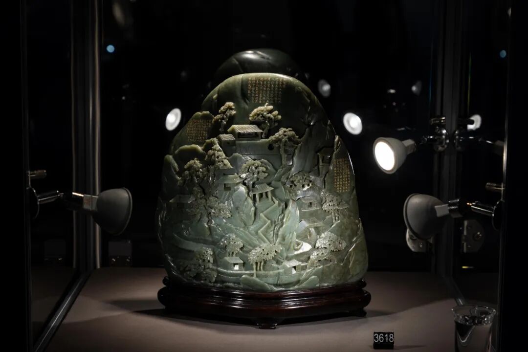 德安堂藏玉,2004年曾在北京故宫博物院永寿宫展出,琼瑛琳琅,首推乾隆和阗青玉寒山听雪阁山子,阴刻填金御制诗六首,烘托迭翠峦峰之磅礡。且有高福履旧藏明代黄玉骆驼,尺寸硕大,雕琢生动。