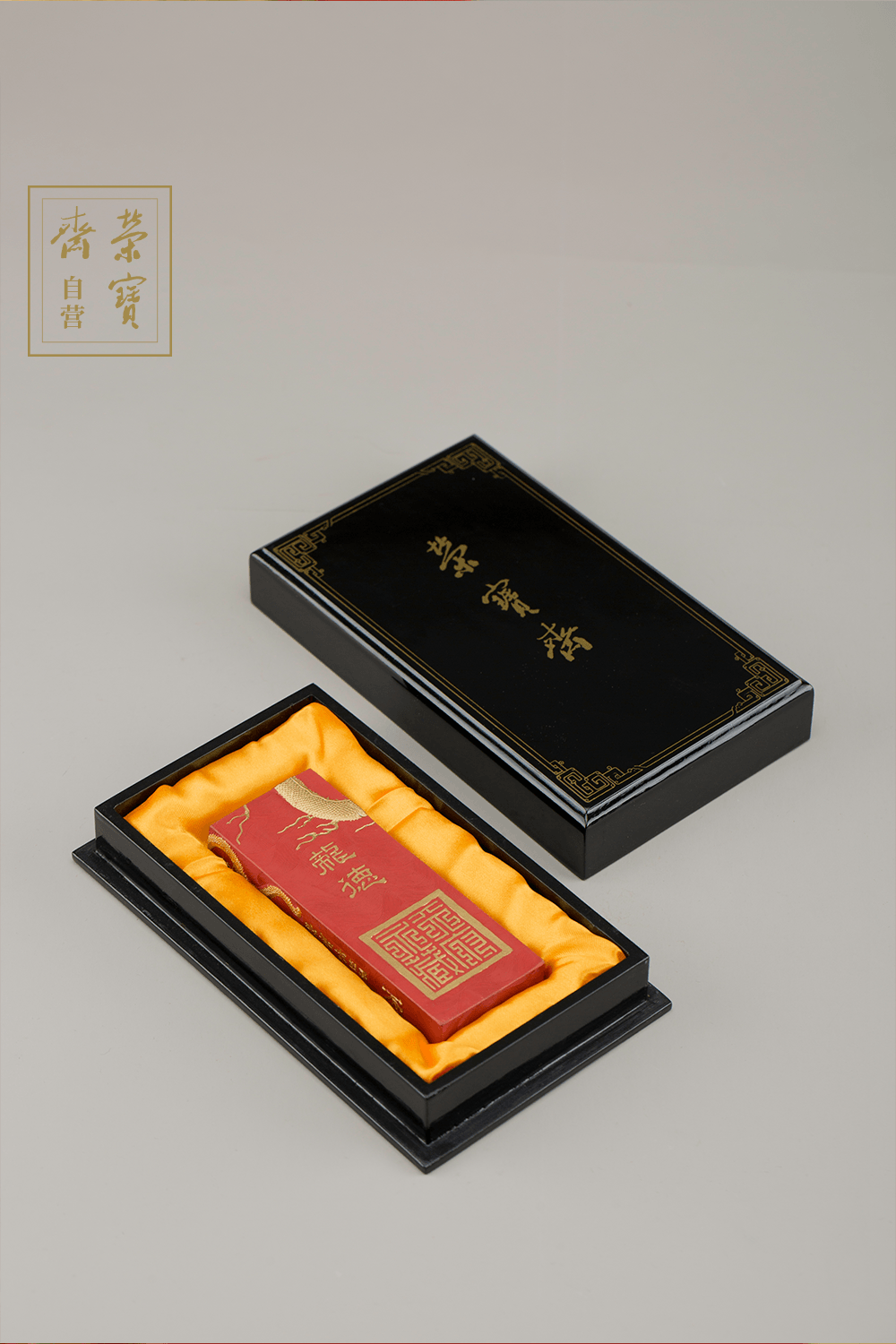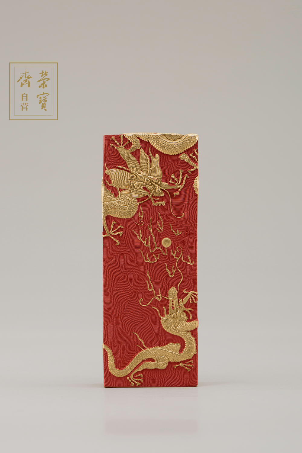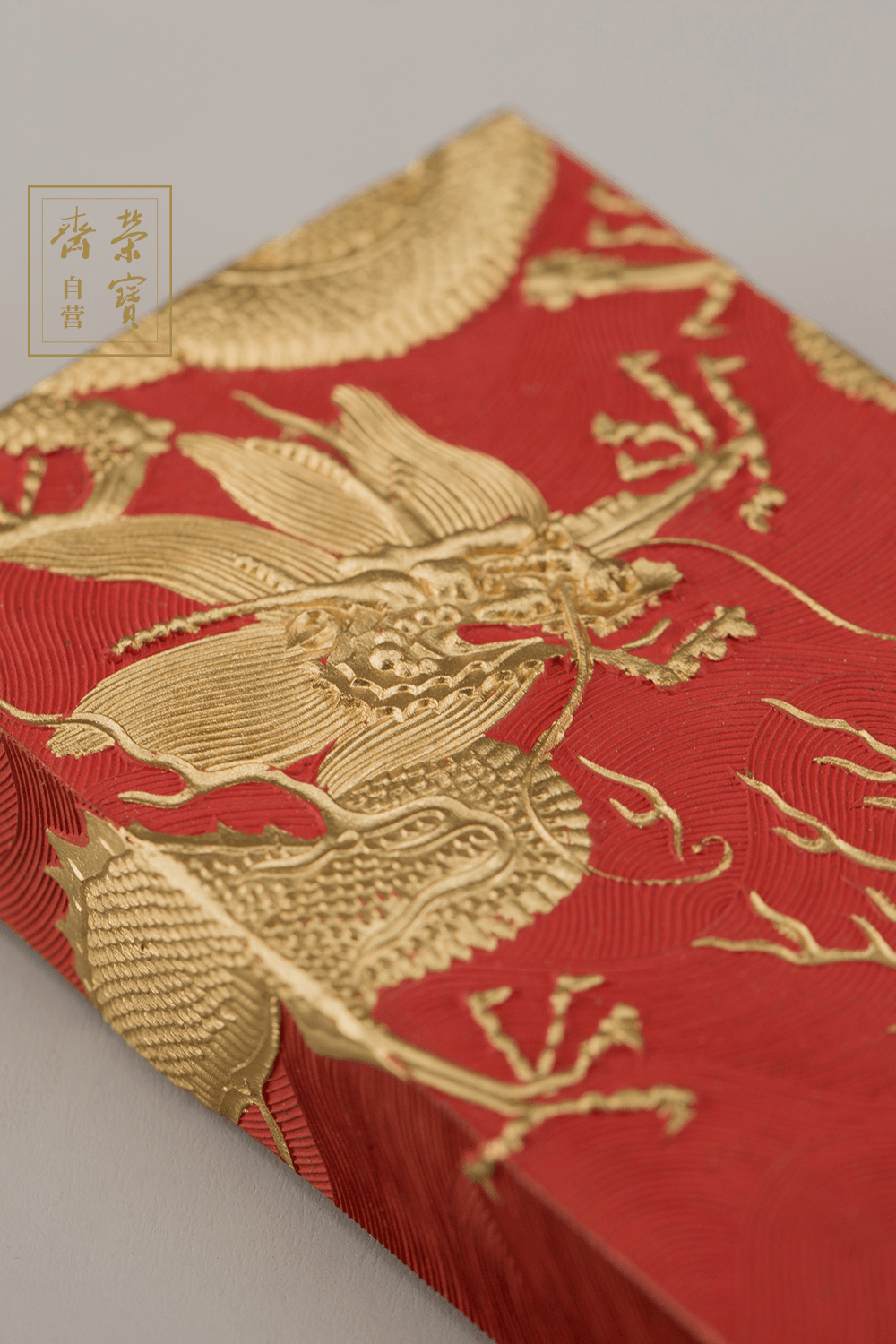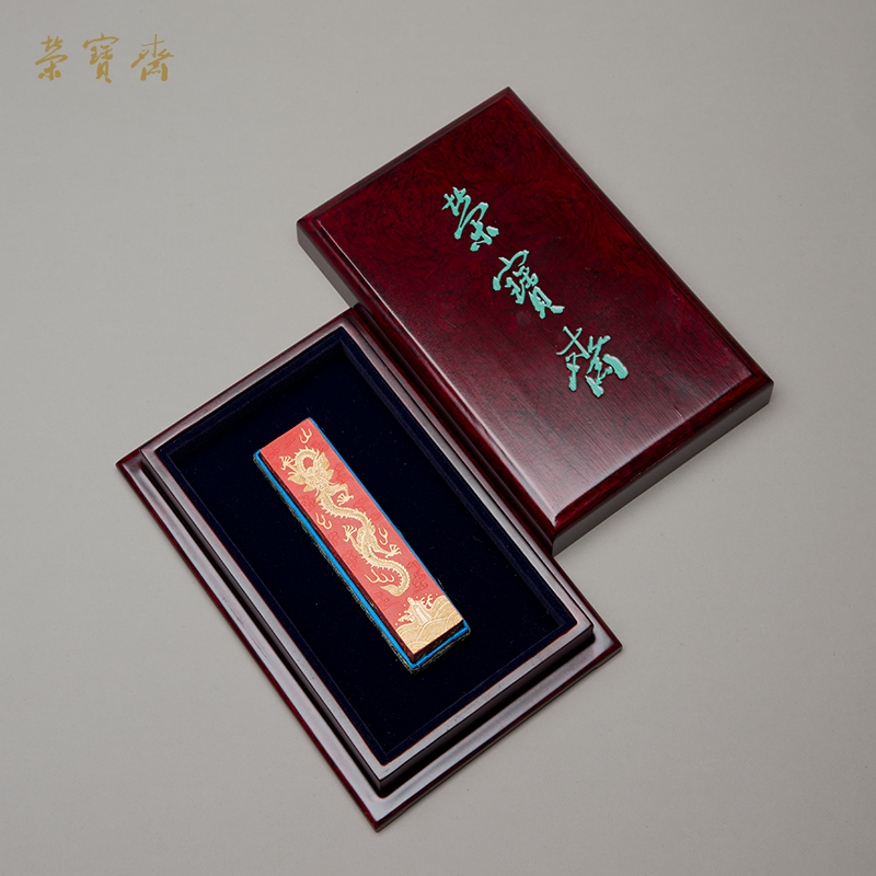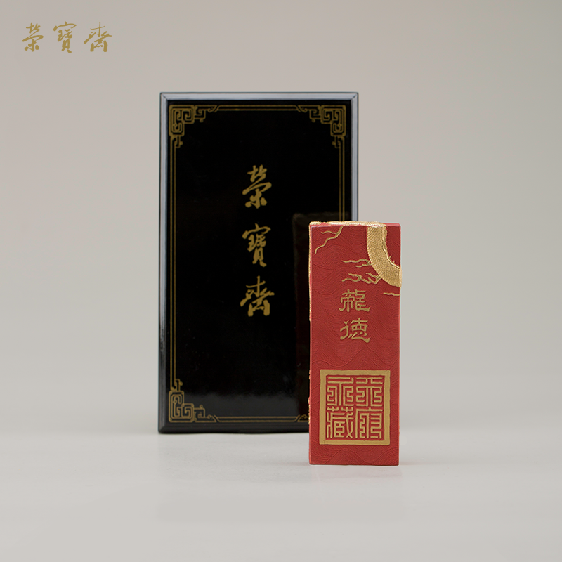 荣宝斋云龙朱砂墨为我斋专版定制,形制规整,刻镂繁密,六面满刻,皆极精美。为凸显朱砂质感调整了描金,整体形制大气雅致。正面描金江崖海水,五爪金龙腾飞,背面祥云烘托吉祥八宝,侧面三面云蝠,底面为“荣宝斋”款识。