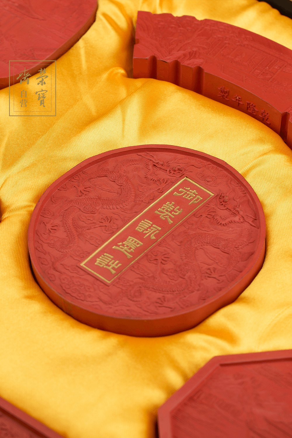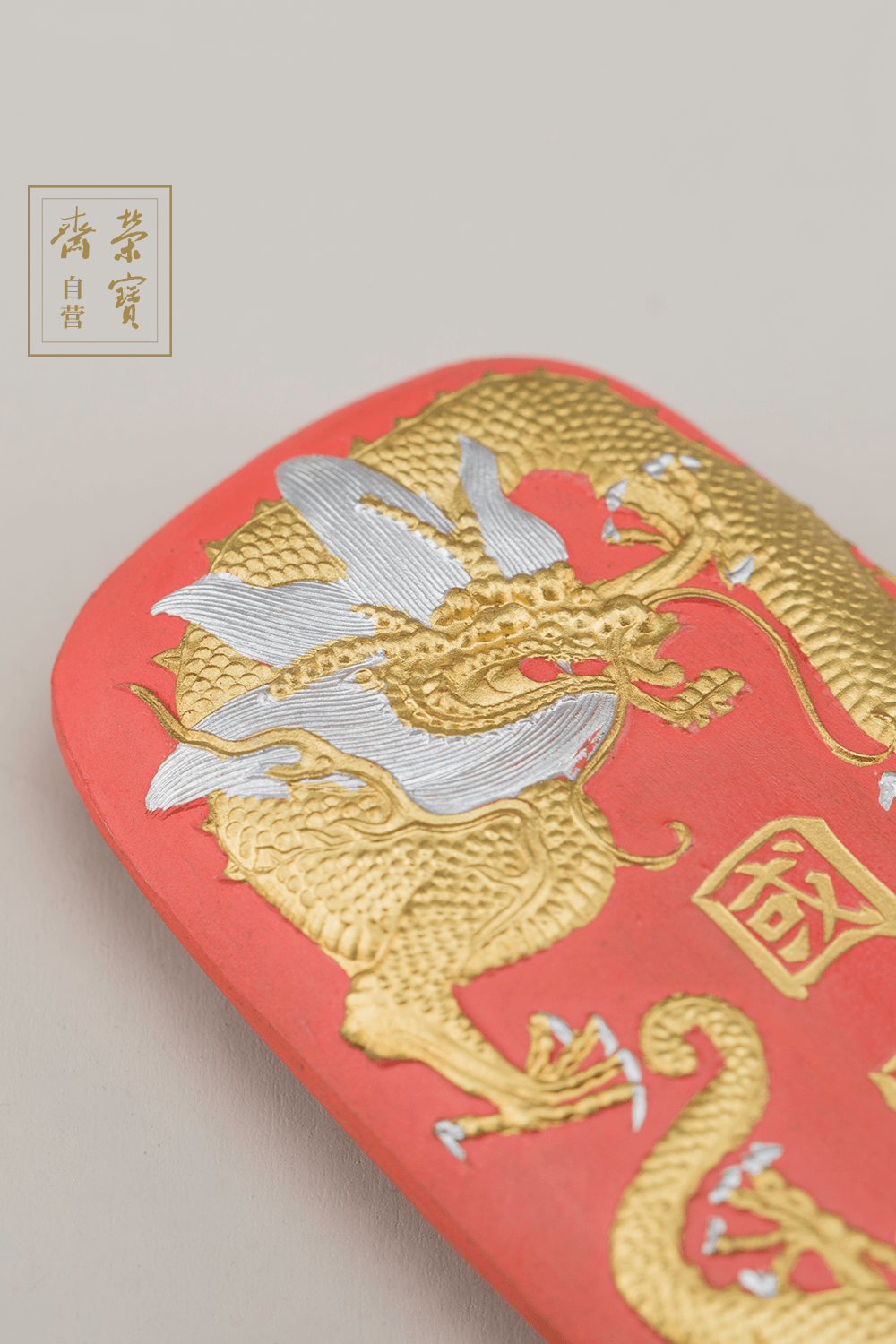此版依据荣宝斋收藏的故宫养性殿珍藏乾隆御墨复刻,通体龙纹立体浮雕,六面环绕,通身流水底纹,细如发丝,是手工制版工艺的顶尖代表。本款墨作为贡墨典范,形制规整,刻镂繁密,龙纹威猛生动,独具皇家庙堂气象,复以荣宝斋严选工艺大师复刻为朱砂墨,代表当代制墨顶流工艺水平。
