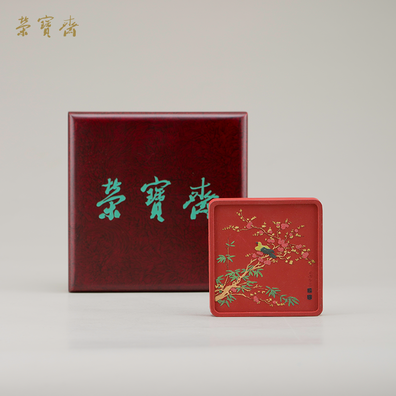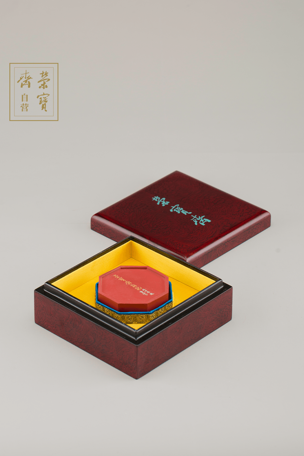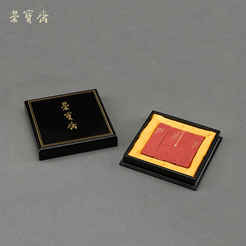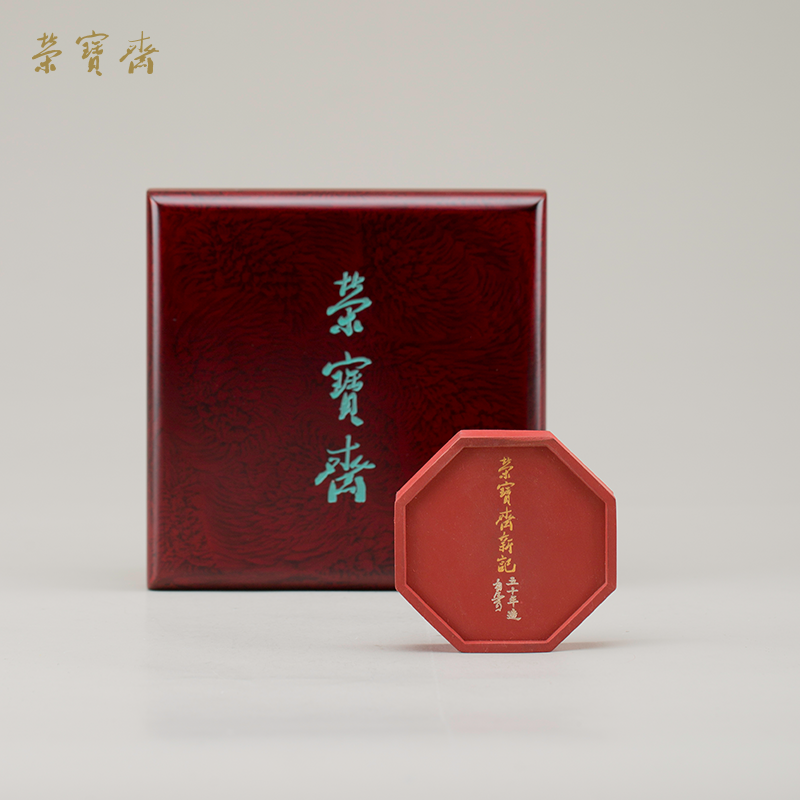 荣宝斋定版朱砂墨均采用天然原矿朱砂配以墨厂自熬牛皮胶,遵循传统工艺制作,用料上乘;研磨出液细腻,色彩纯正,鲜亮温润;形制多种多样,装饰图案华丽精美,完全融合了文人独特的情趣和在内审美于一体。