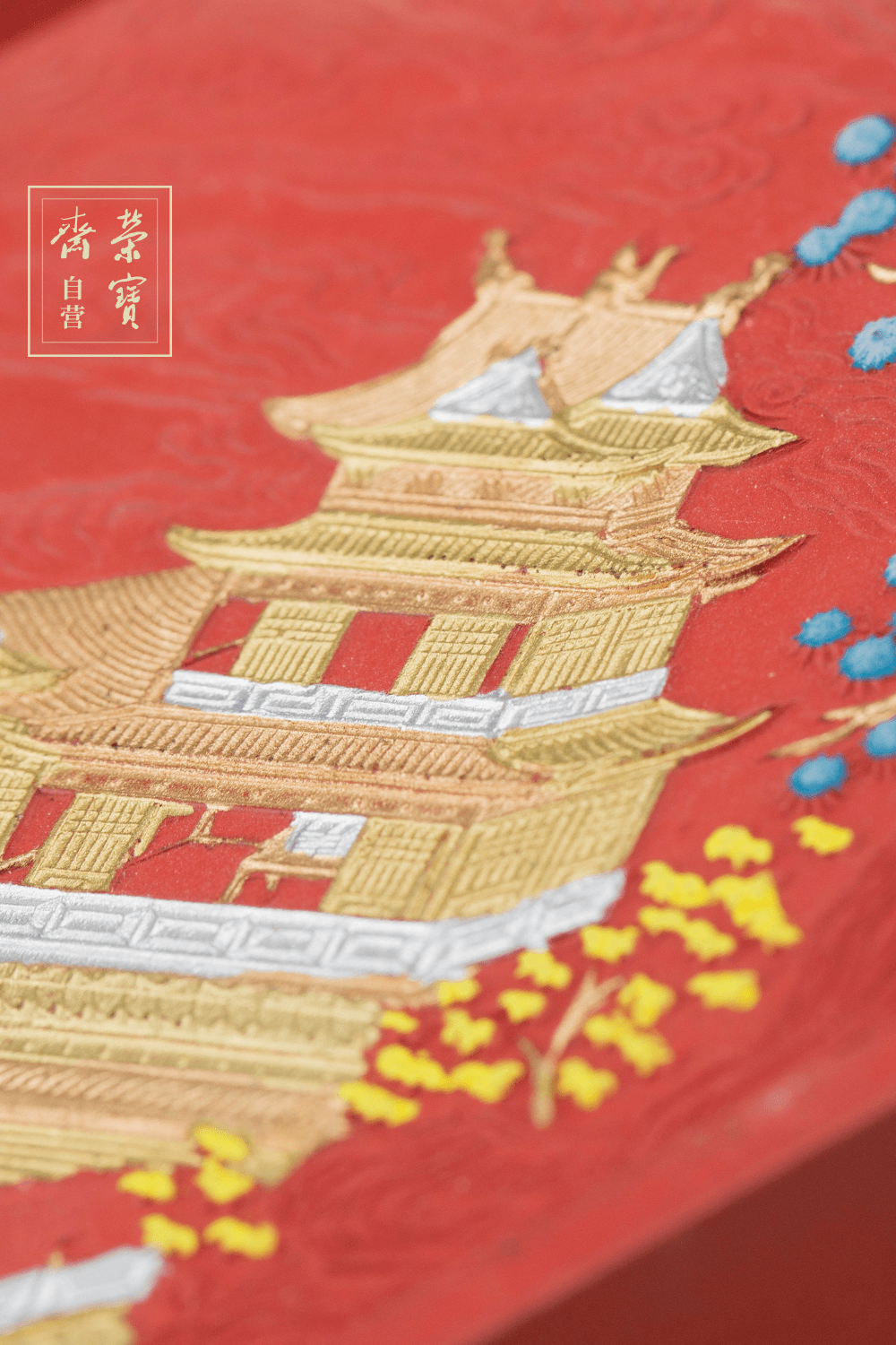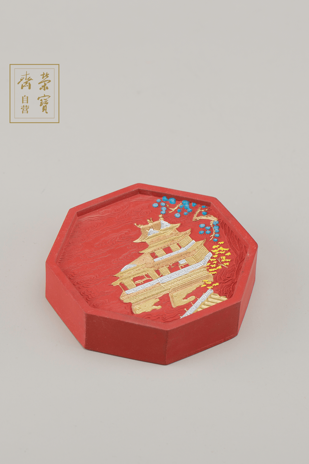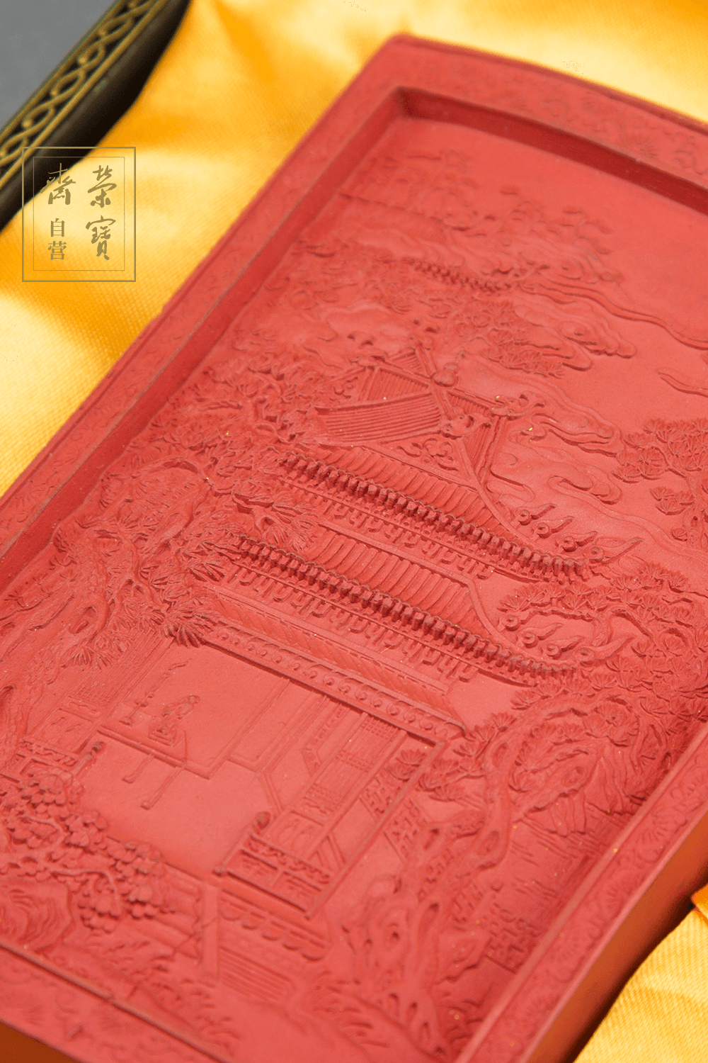荣宝斋定版朱砂墨均采用天然原矿朱砂配以墨厂自熬牛皮胶,遵循传统工艺制作,用料上乘;研磨出液细腻,色彩纯正,鲜亮温润;形制多种多样,装饰图案华丽精美,完全融合了文人独特的情趣和在内审美于一体。