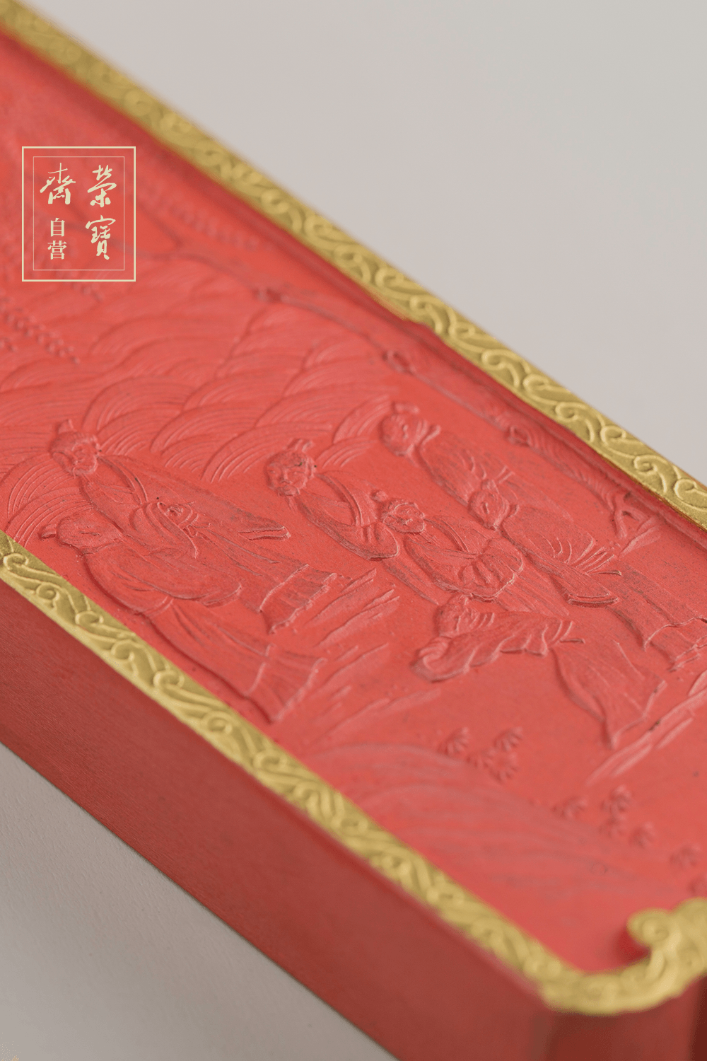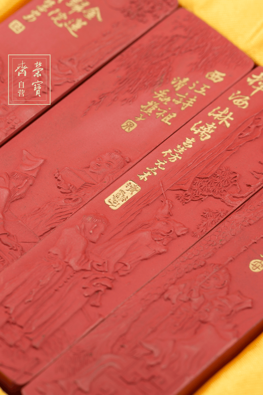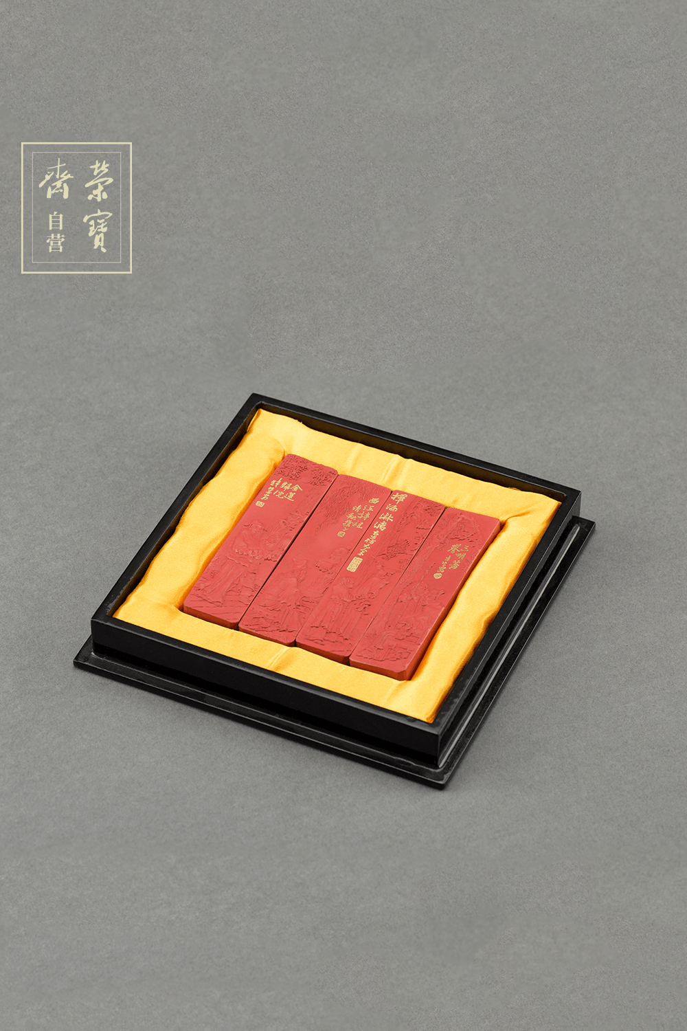 此套朱砂墨,墨版制作工整,线条流动有力,细节一丝不苟,古朴立体。四锭为一套,汇集苏黄米蔡四大家典故,海派大家代表人物画作,荣宝斋精选工艺,堪称精品。