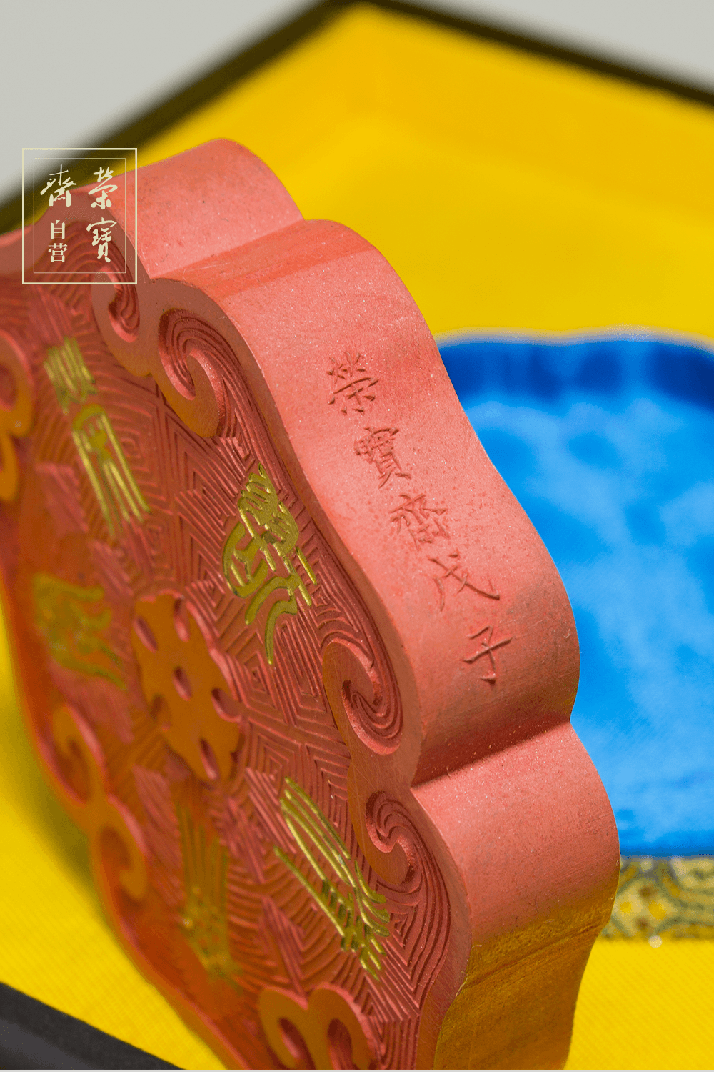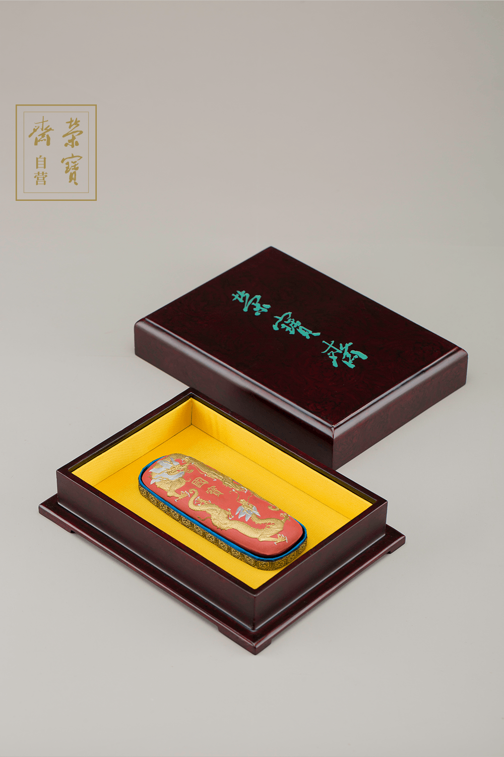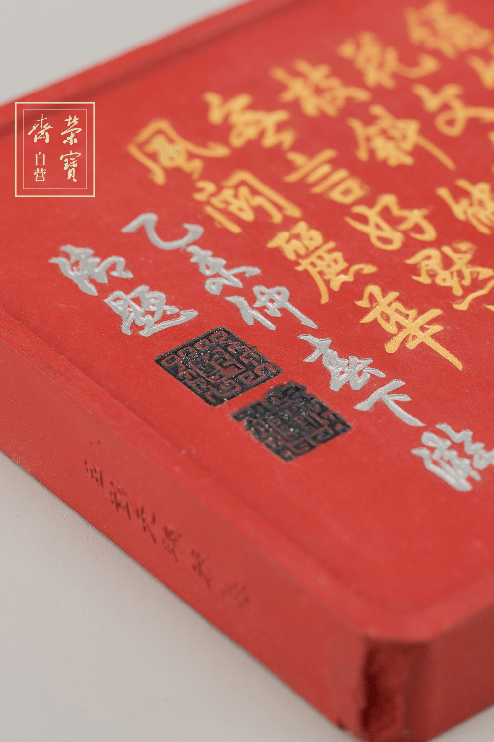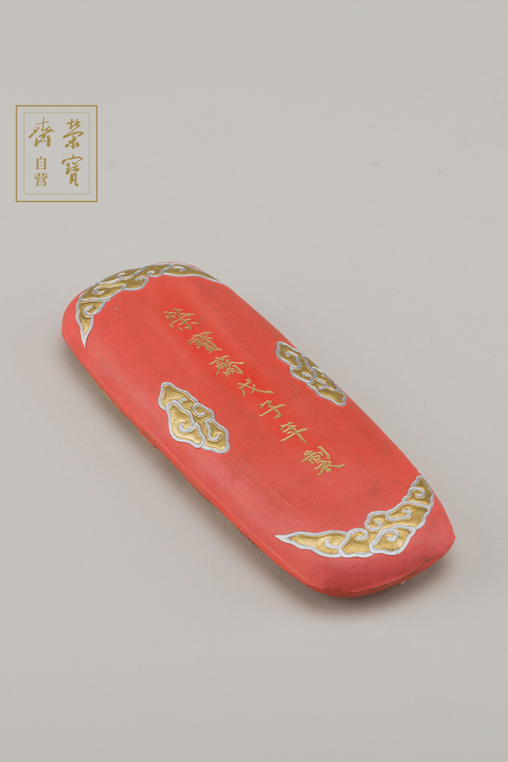 此款朱砂墨为荣宝斋戊子年(2008年)订版墨,正面描金银五爪双龙,刻画逼真,栩栩如生,并将“国宝”二字围绕中间;背面描金银祥云,中间描金阴刻:“荣宝斋戊子年制”楷书款识。