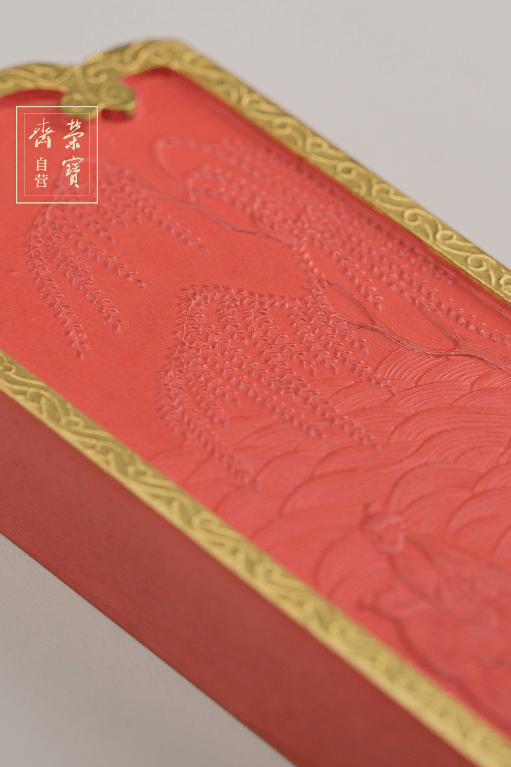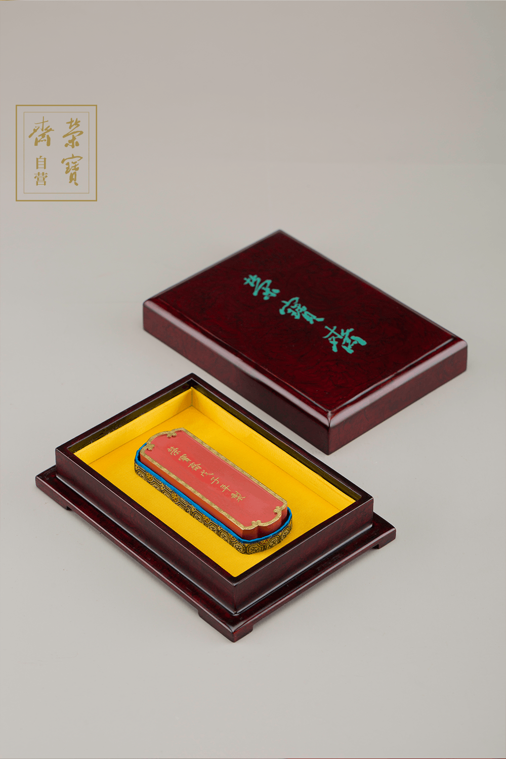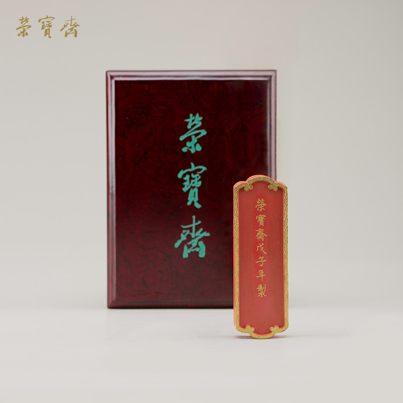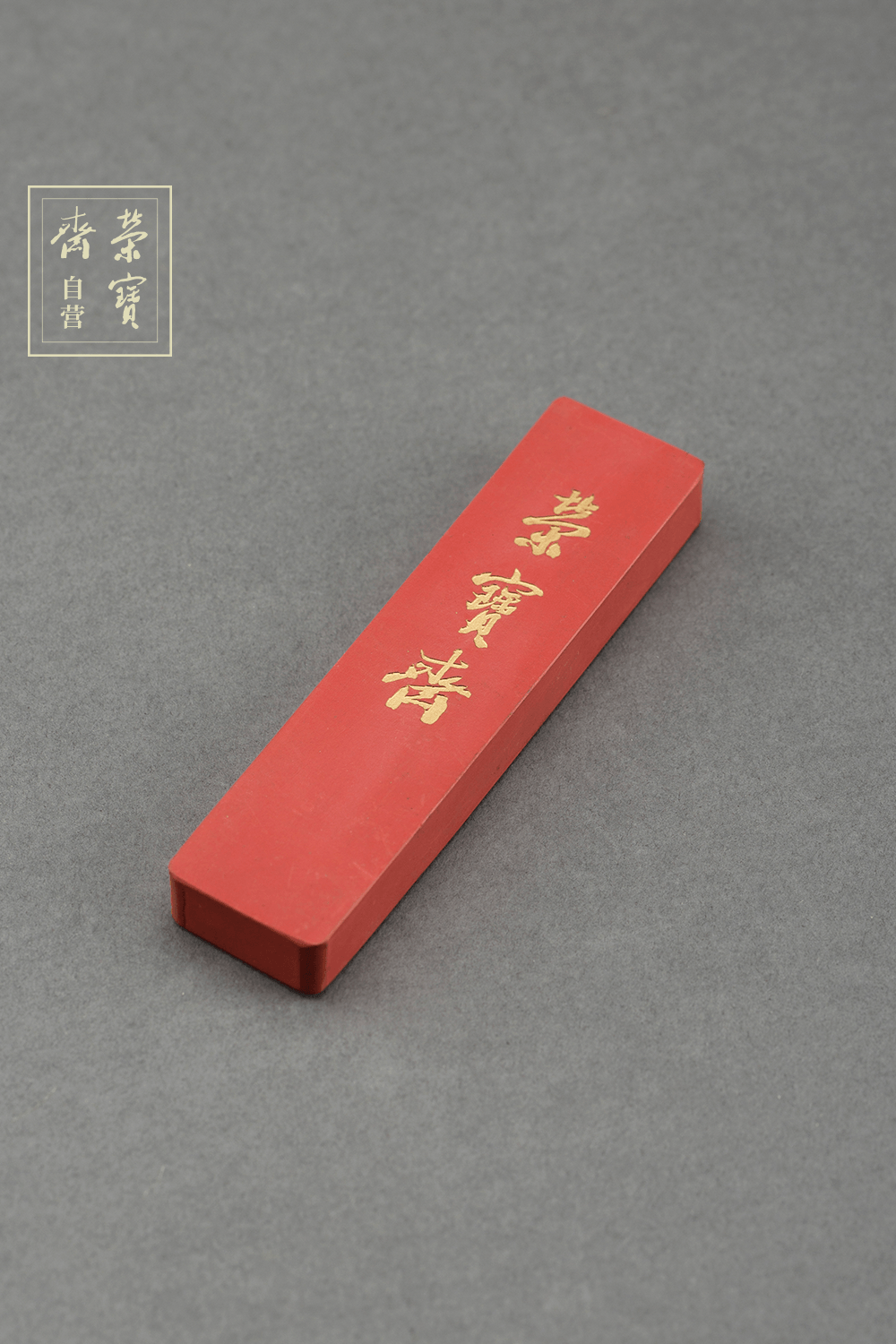 荣宝斋清玩朱砂墨为我斋专版定制,版型采用旧版墨改良定制而成,正面五字“荣宝斋清玩”,反面五字“翰墨书画缘”,整体造型清新古朴,规矩雅致。