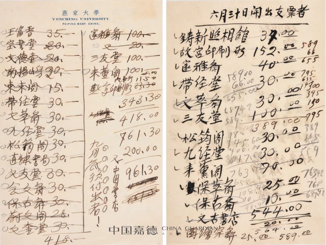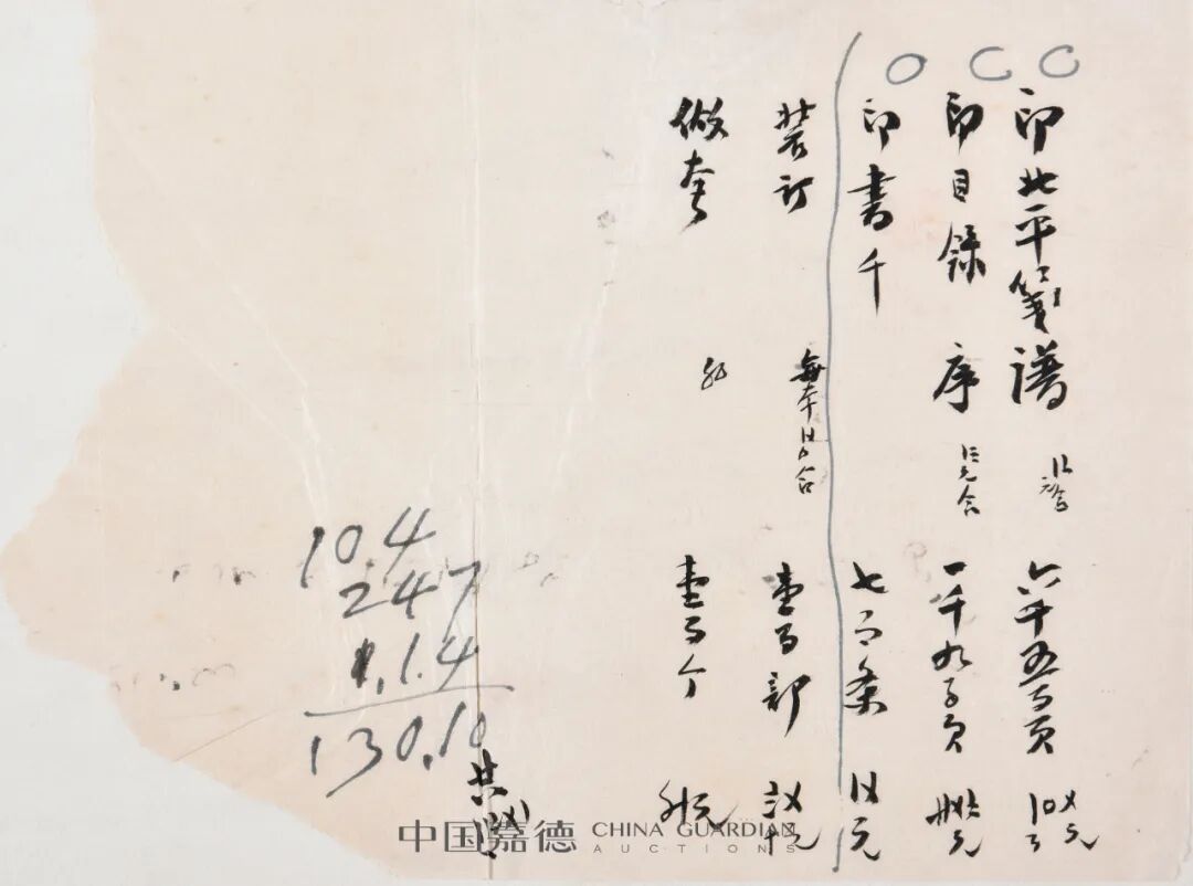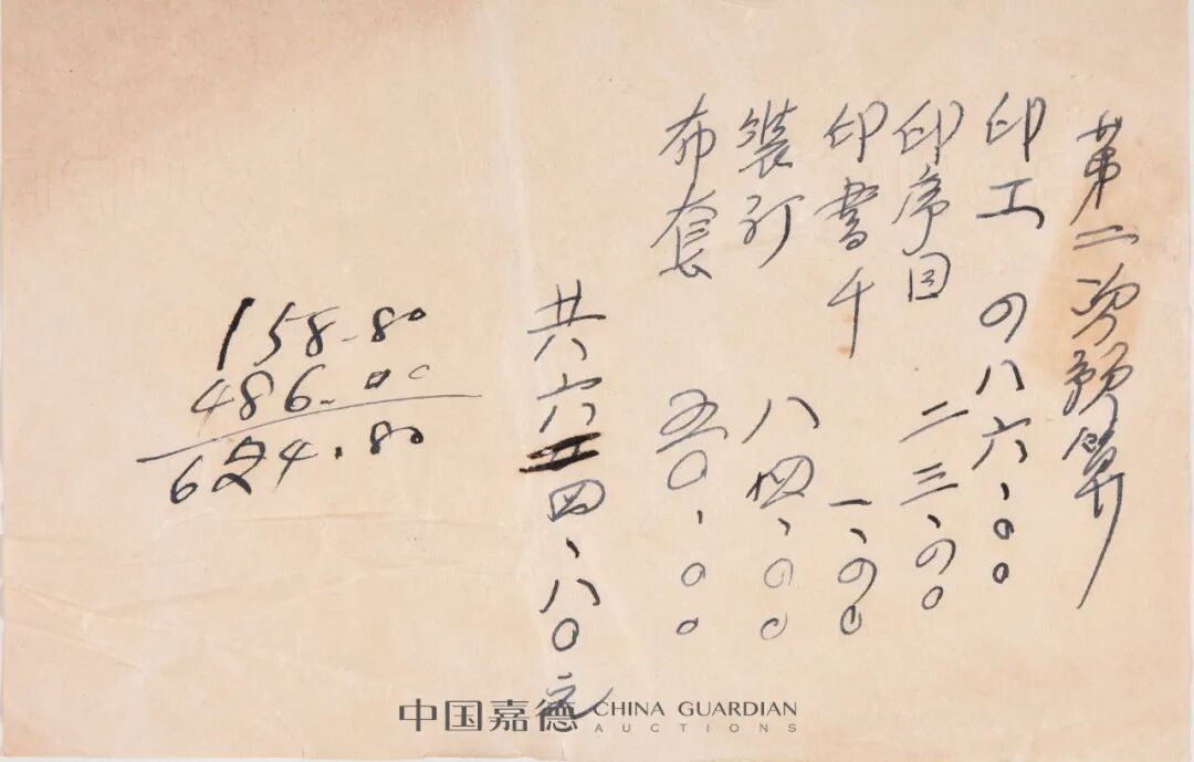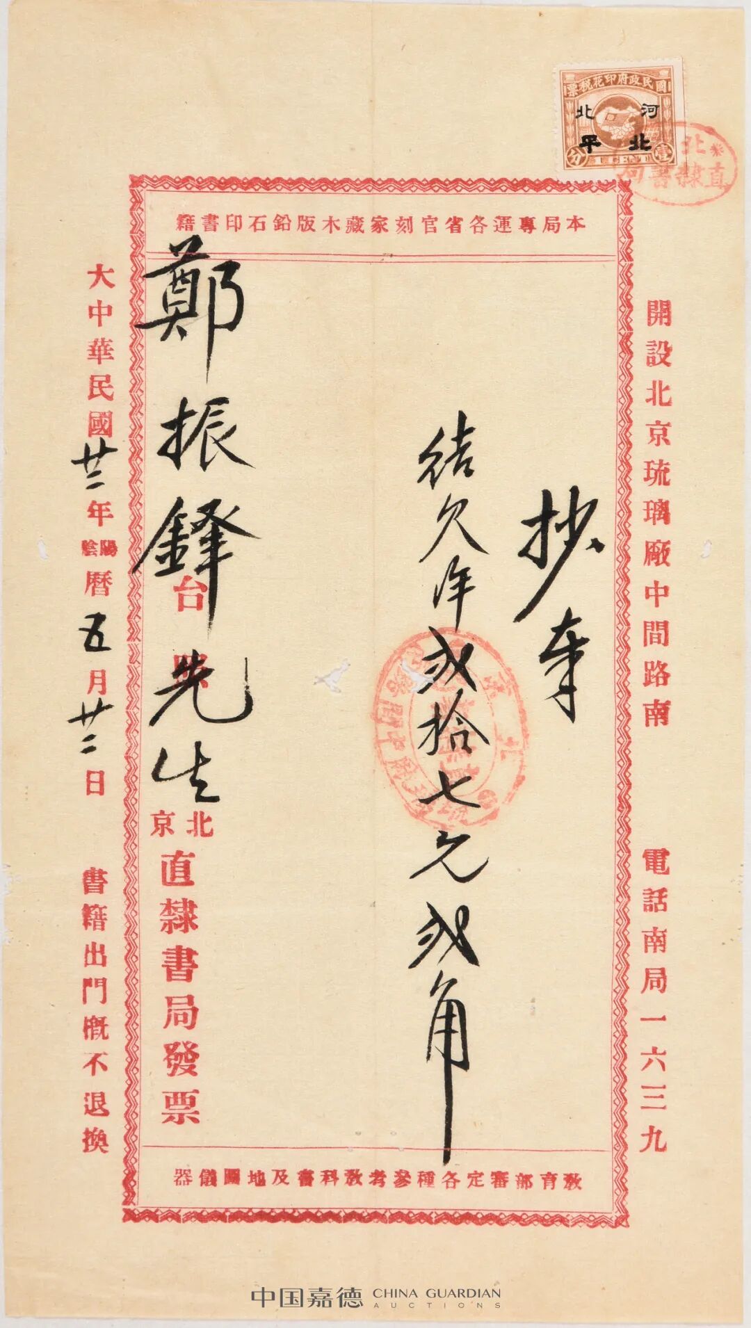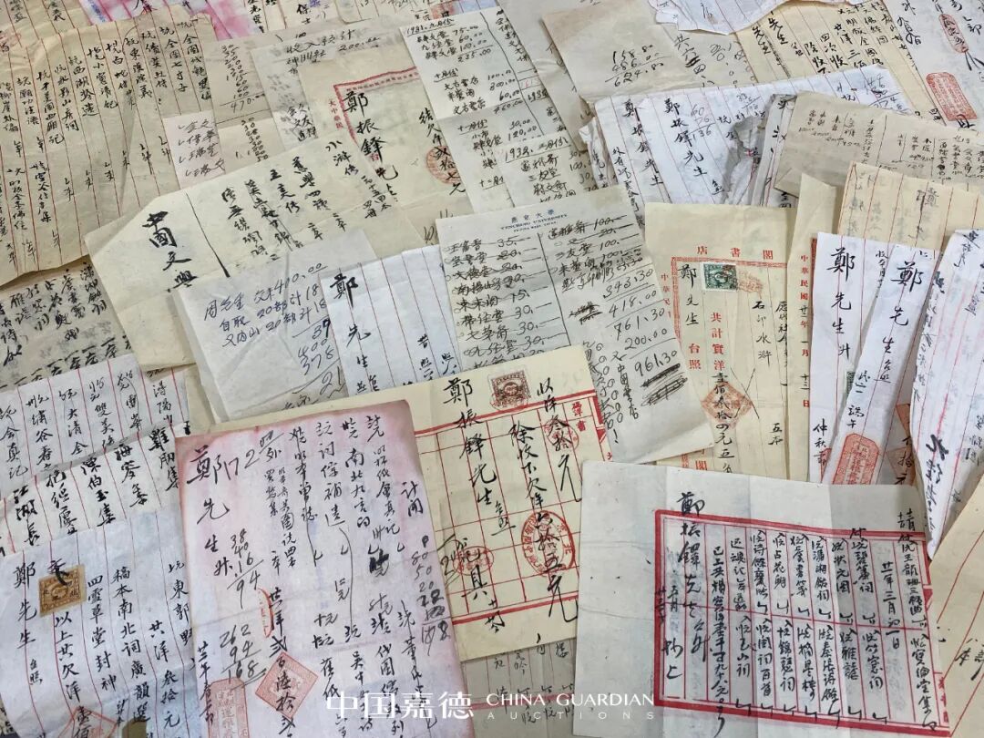 “古籍文献”专场选取历代古代典籍、文献资料95件。典籍方面,郑振铎便笺及民国间各大书局致郑振铎书账一组,涉及郑振铎编印《北平笺谱》史料,每月版权、稿费收入以及在各大书局购书支出等。此外,富晋书社、松筠阁、邃雅斋、文奎堂、带经堂、来青阁、直隶书局、铸新照相馆等各大书局账单,可见郑振铎搜集古籍之旨趣,另可窥见民国古籍市场变迁,史料价值颇高。