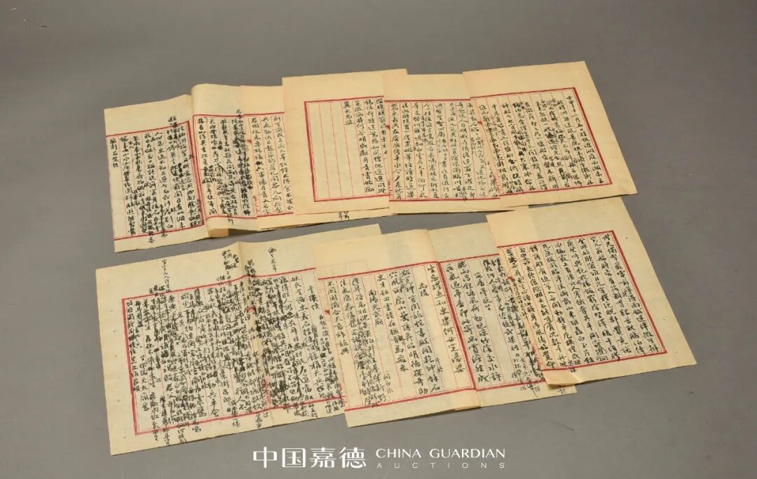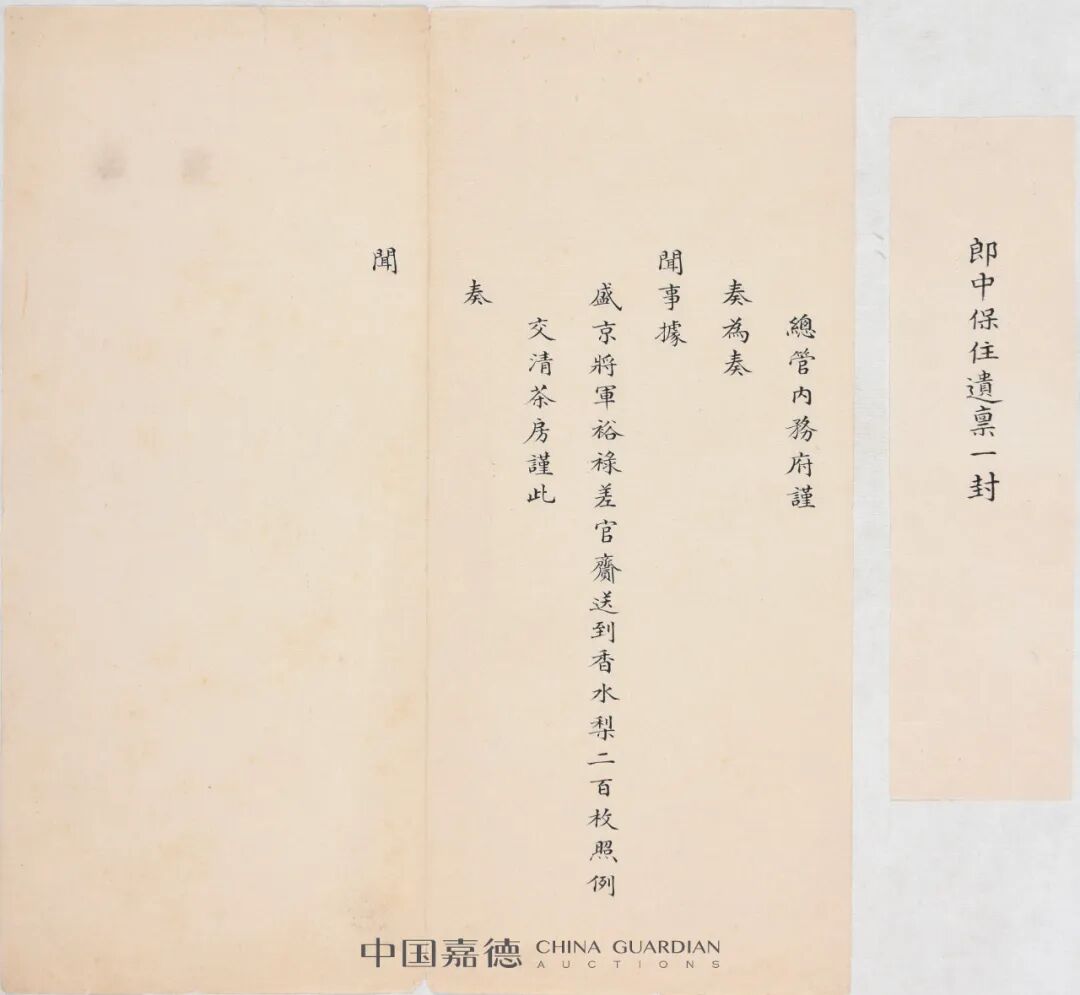 文献资料方面,晚清民国各类公文异彩纷呈。清光绪间总管内务府为盛京将军裕禄呈送香水梨奏折题材独特,清光绪间写本湖北武昌府审讯会犯供折,涉及康梁变法、两湖书院史料,为反映晚清民国动荡之际民间最真实的写照。晚清民国期间任职于江苏的王曜资料,涉及各类官方公文,品类广泛。Lot 13051
