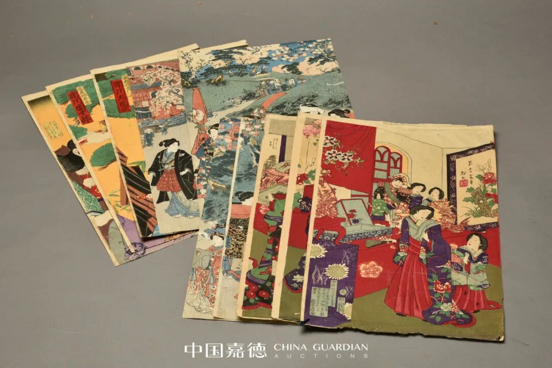 “中外版画木版水印”专场包括中国、日本、欧美等各种技法版画作品40件,涉及木版画、铜版画、蚀刻版画等各种品类,其中1930年巴黎刻印出版常玉刻印《陶潜诗选》限量发行,此次征集所得为第96部。此书系常玉受邀为法文版《陶潜诗集》制作蚀刻版画3幅,由巴黎著名出版商印行,中国诗人、翻译家梁宗岱翻译。日本浮世绘部分汇集多为大师作品,丰斋香朝楼、歌川国贞、杨洲周延三人所作版画最具东瀛风情。木版水印部分汇集荣宝斋、朵云轩等复制齐白石、徐悲鸿等人作品,逼真肖妙,生动传神。