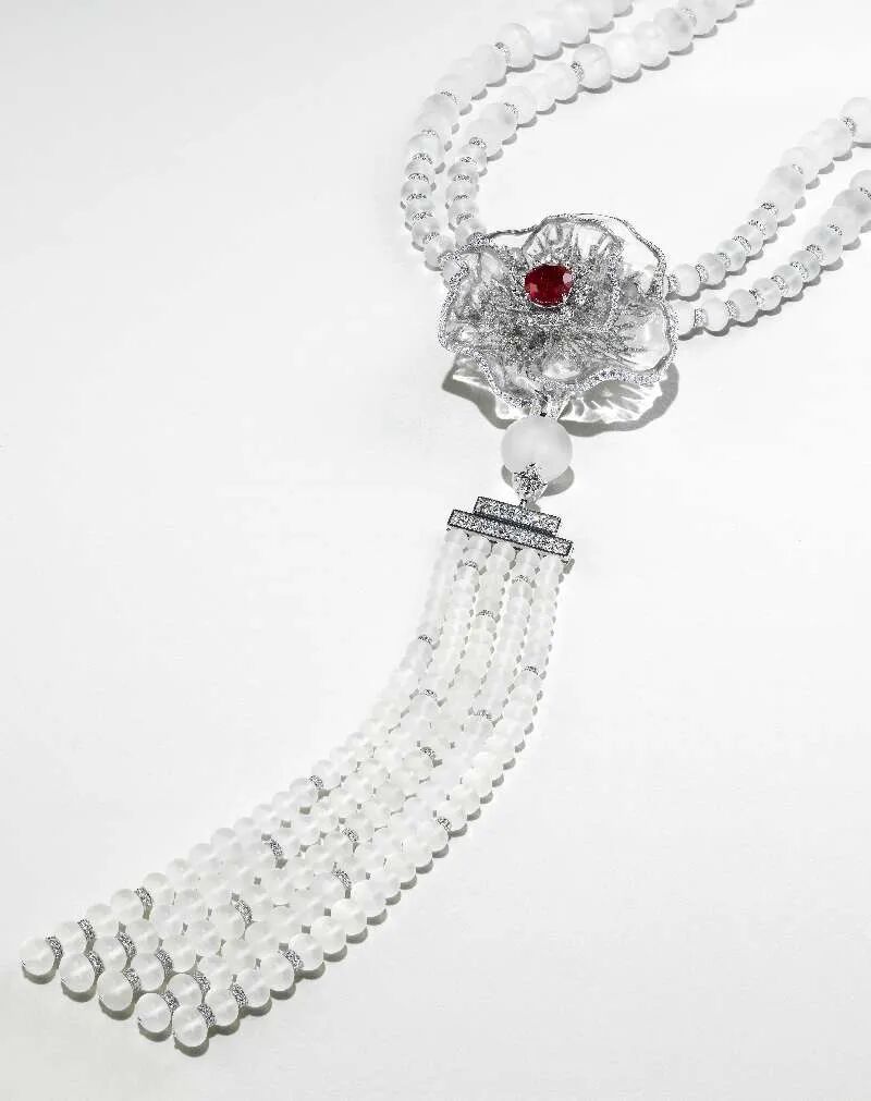 7.64克拉缅甸天然鸽血红红宝石 “Fleur de Pluie” 项链估价:港元 12,000,000 - 18,000,000![]()