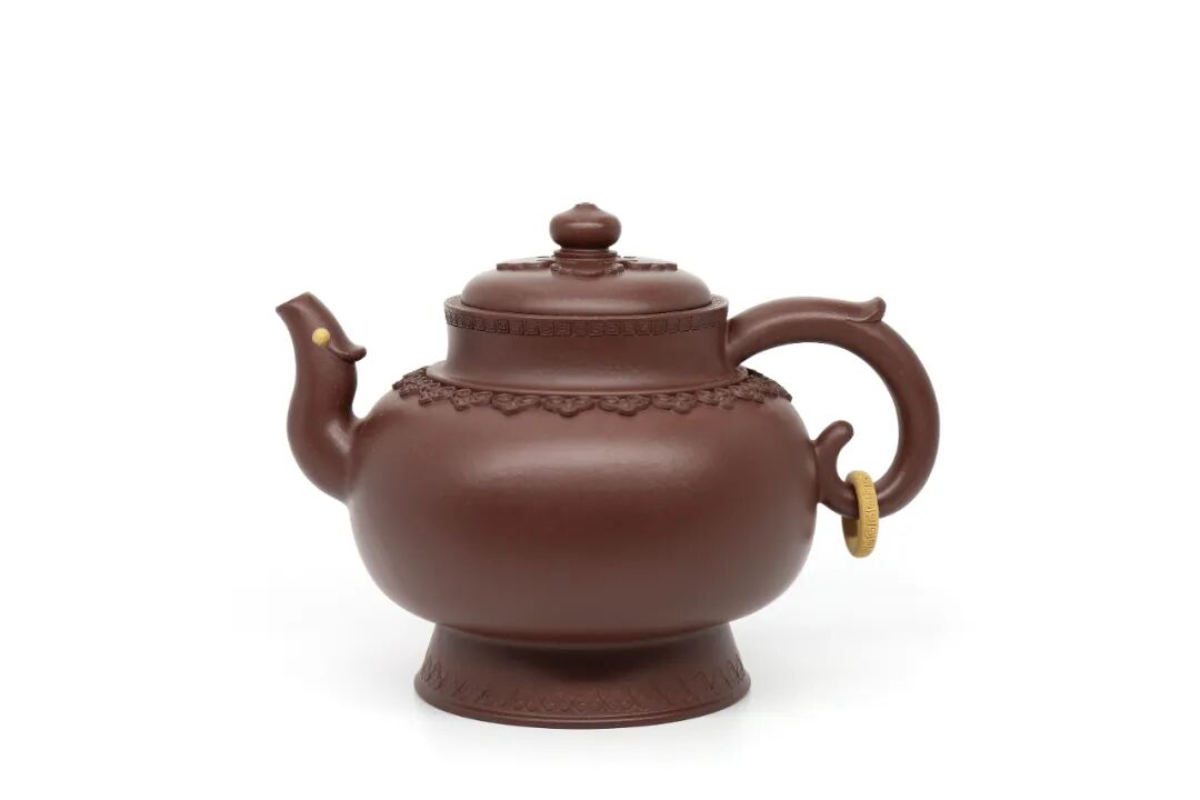 韩旭作品《凤鸣如意》,型取古青铜器而来,整体大气端庄,鼓圆身筒丰腴饱满,高圈足稳扎,壶流昂而向上,段泥点睛,如抬首凤鸣,寓意凤鸣吉祥。环把似欲发之弓,又似凤尾,饰以回纹金环,更见和谐有趣。壶口沿以回纹饰之,壶肩阳如意,壶底阴如意相呼应,寓意富贵如意。底足刻绘“追慕古人得高趣,别出新意成一家”表达作者摹古创新的追求。置于案头,庄严威武和雍容华贵之美凝练在壶体,神秘高贵之气扑面而来,令人动容。展览: