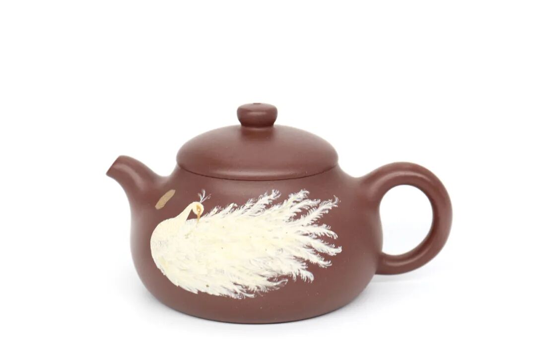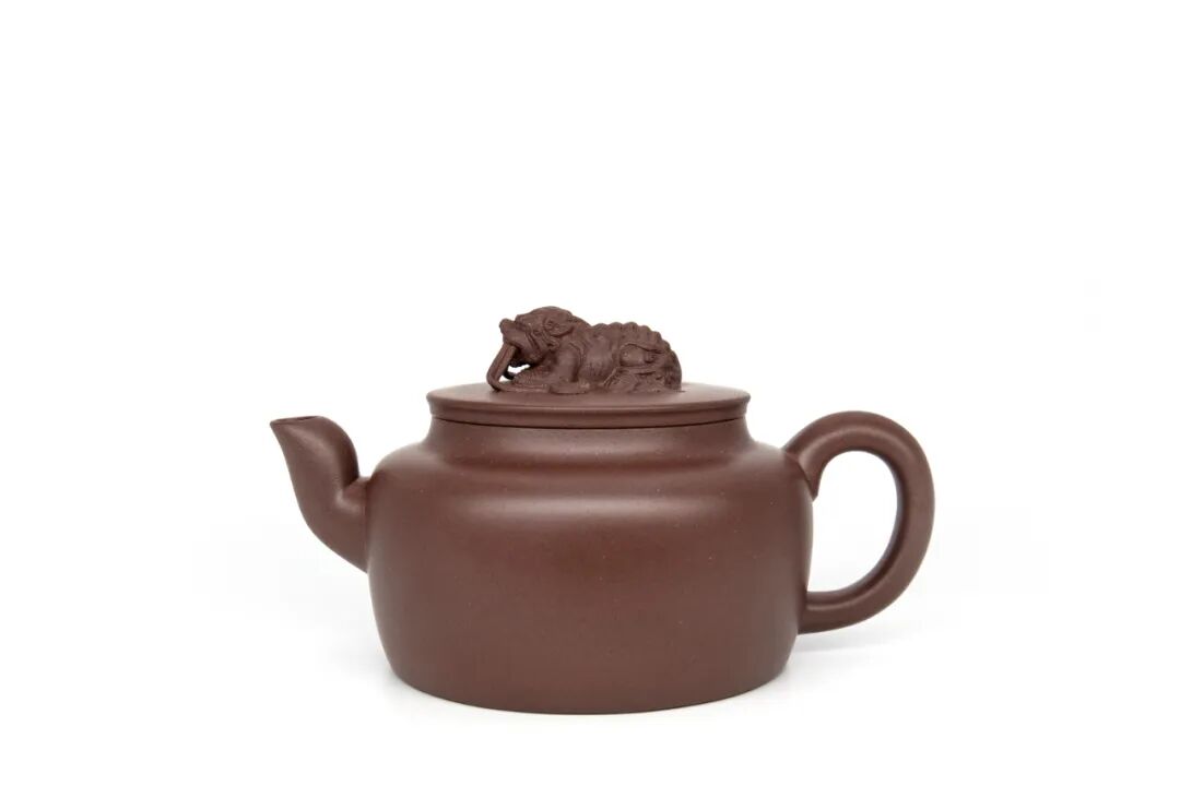 任伟作品《孔雀开屏》,以孔雀开屏为题材,寓意吉祥如意、前程似锦、白头偕老等。整体壶型饱满圆形,壶钮为圆柱,壶身下部平圆,作品构思设计精妙,寓意吉祥。汤重凯作品《绶带狮钮》,狮纹为祥瑞之兆,象征权利与威严。古汉语中“狮”、“师”同音通假,旧时人们常以狮子图案来祝愿官运亨通、飞黄腾达、万事如意。狮子配以绶带,表示喜事连连、吉庆绵绵。![]()