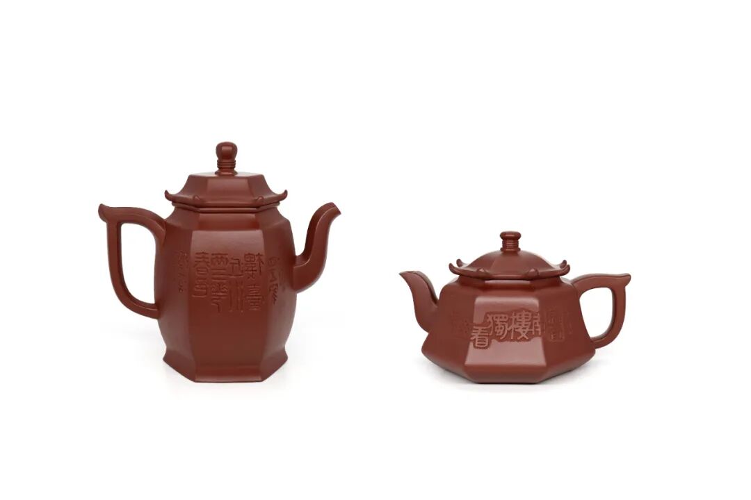 一道飞檐翘角,挑起全壶的气韵,六合八方,觉宇宙之无穷,识盈虚之有数。两壶均极力合乎中式建筑的营造法式,取亭台楼阁之形制,借滕王阁序之意境。山川胜景,聚于方寸,云气蒸腾,散之无涯。